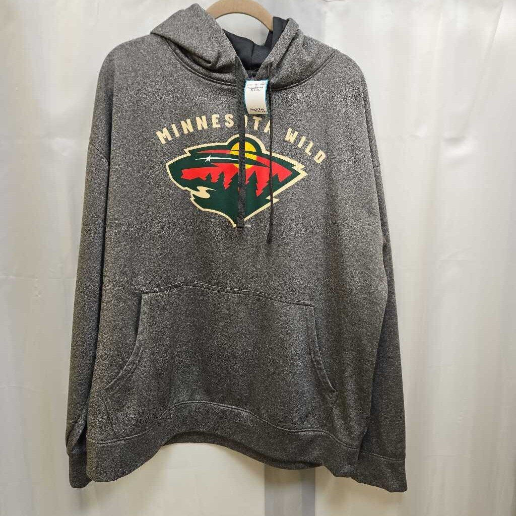 Long sleeve heather grey pull over knit sweatshirt hoodie with kangaroo pockets and Minnesota Wild screen print.
