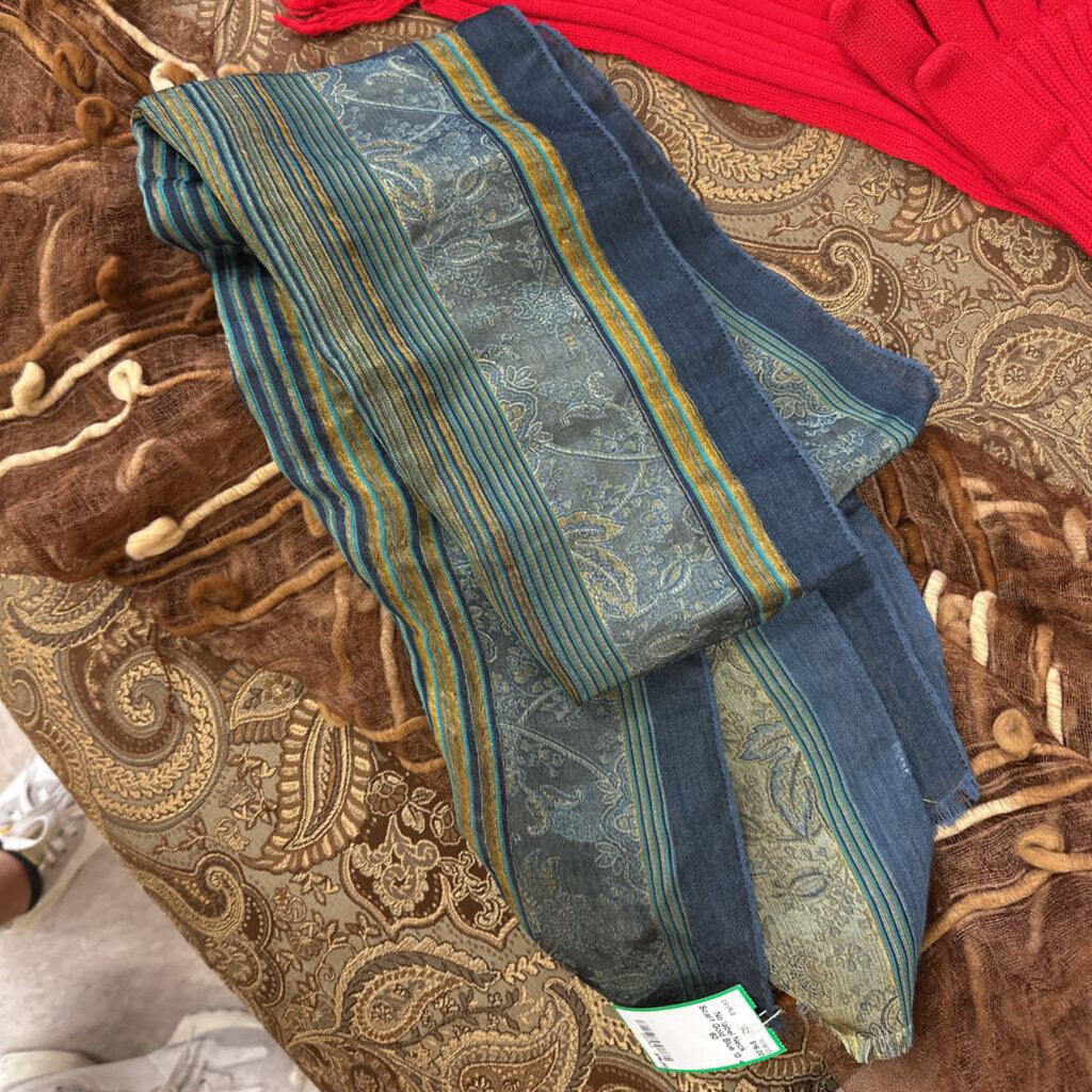 Gold and blue stripe scarf with self fringe ends, feels like silk or a silk blend.