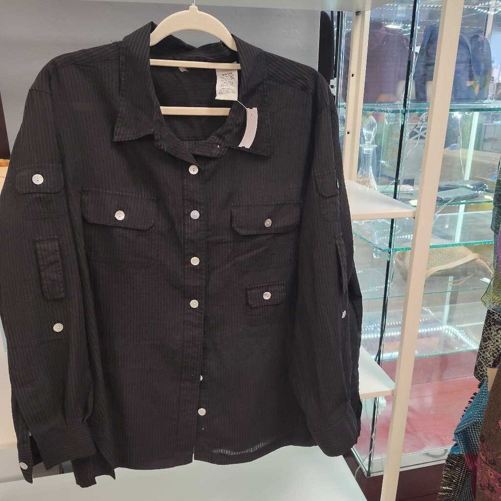Long sleeve burn out stripe button front shirt with three pocket front detail and collar and cuffs.