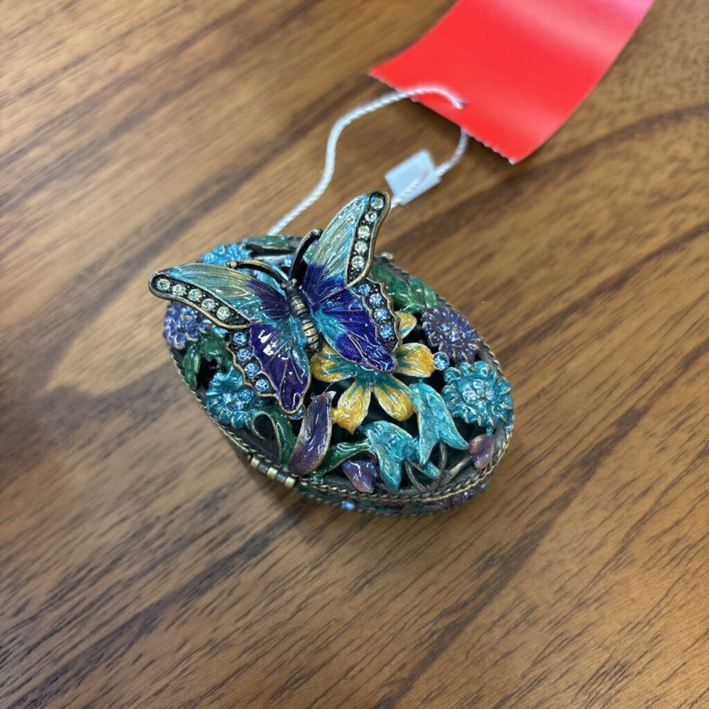 Enameled: purple and yellow butterfly, teal flowers , crystals