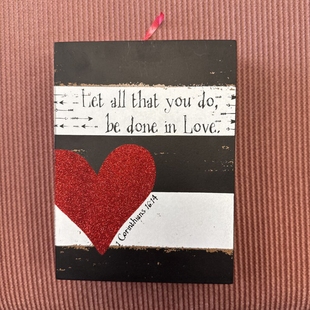 Heart themed Bible verse on wood with red sparkly heart accent.