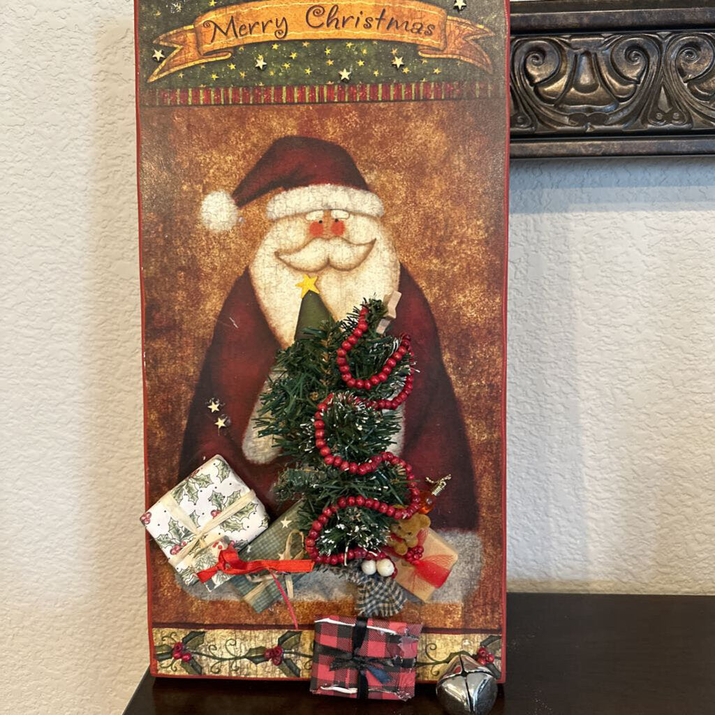 Merry Christmas with Santa, tree and presents. Hanging bell