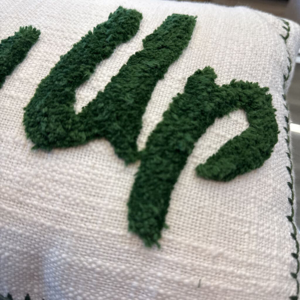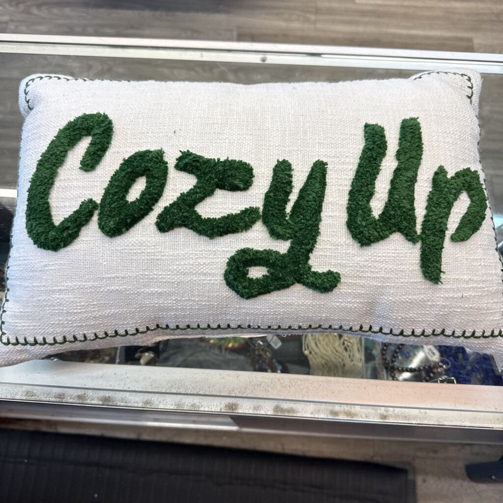 cream colored pillow; textured material; "Cozy Up" in furry material
