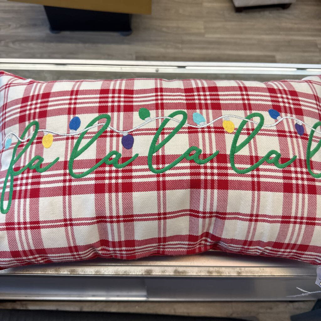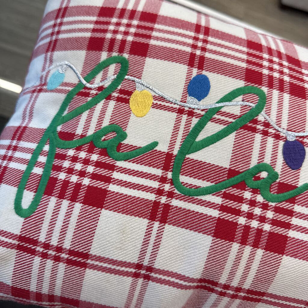 plaid throw pillow embroidered with "fa la la la"