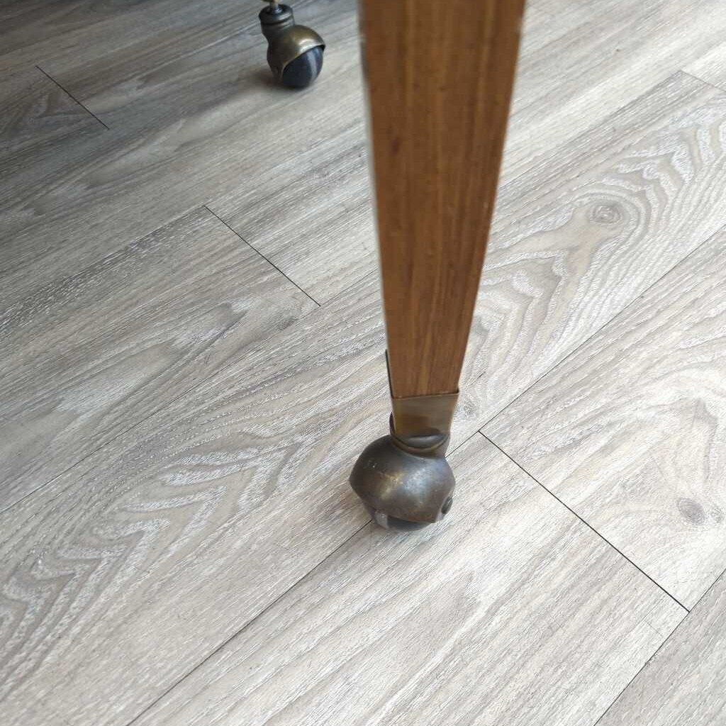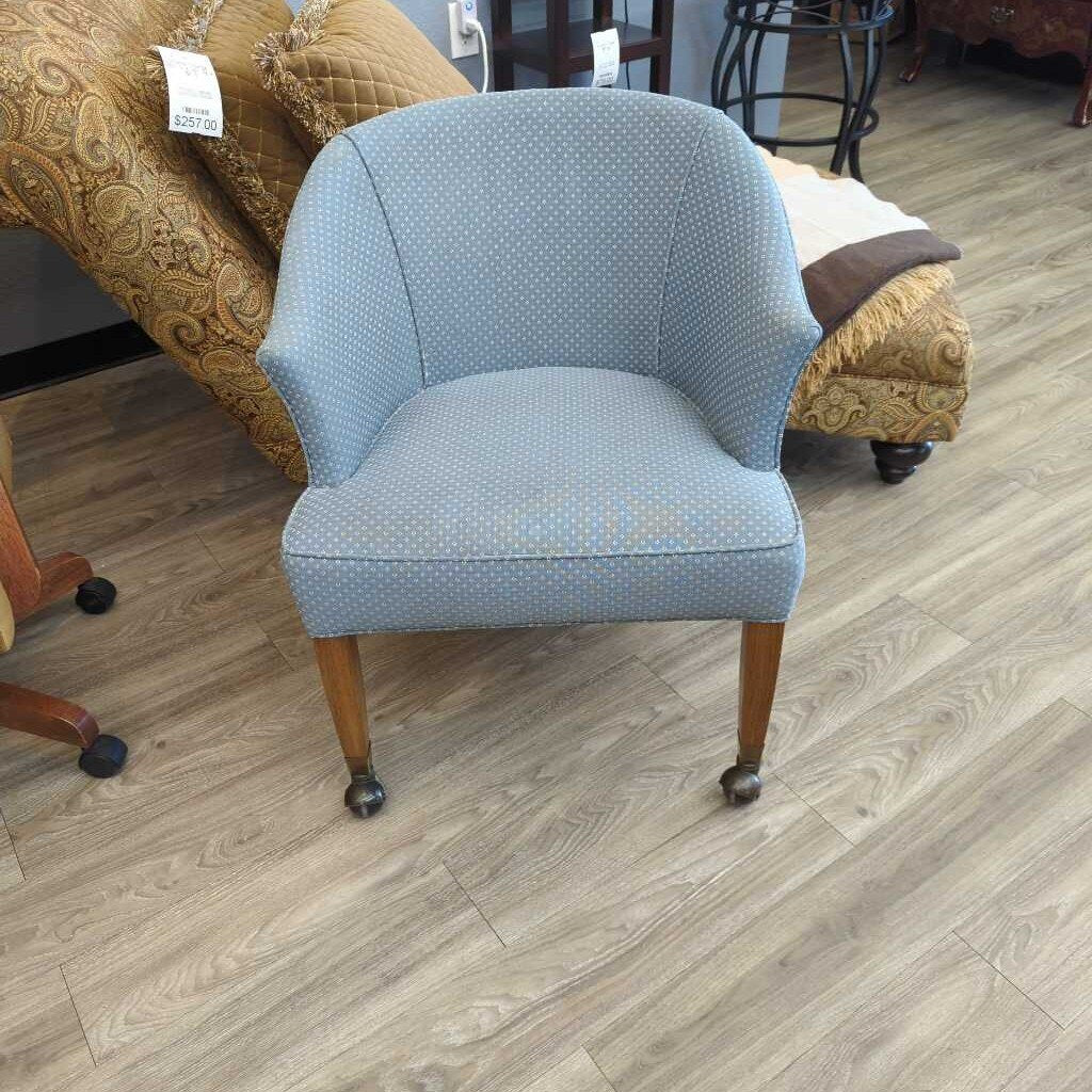 MCM barrel style chair with casters. There is a small stain on the seat. one wheel loose