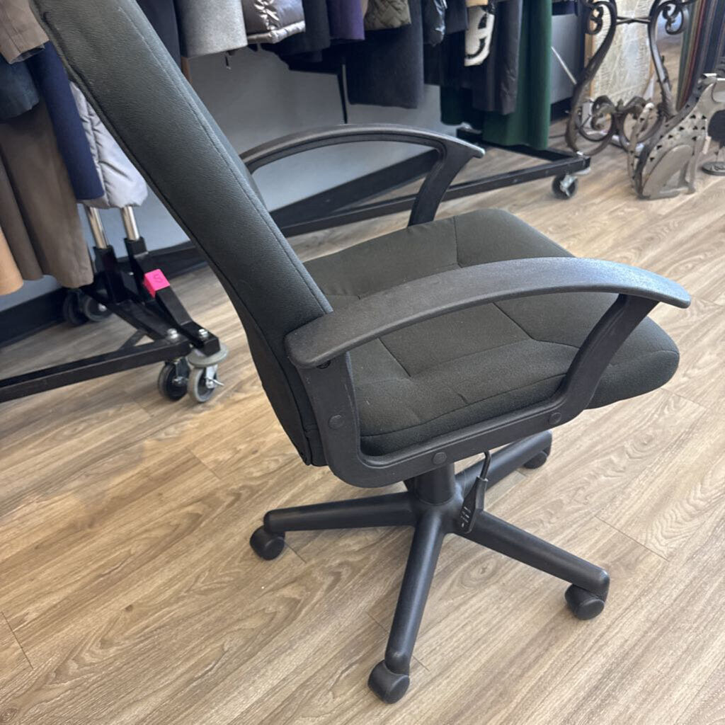 adjustable height; swivels; on casters; cloth upholstery; formed plastic armrests over metal frame; some minimal signs of wear