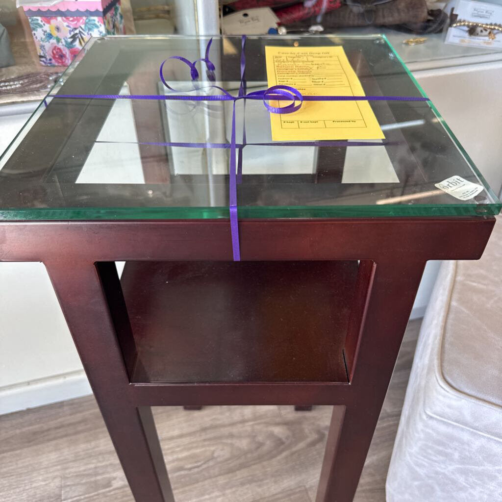 30" tall; 1/2" thick glass on top of table; one small shelf below; could be great plant stand