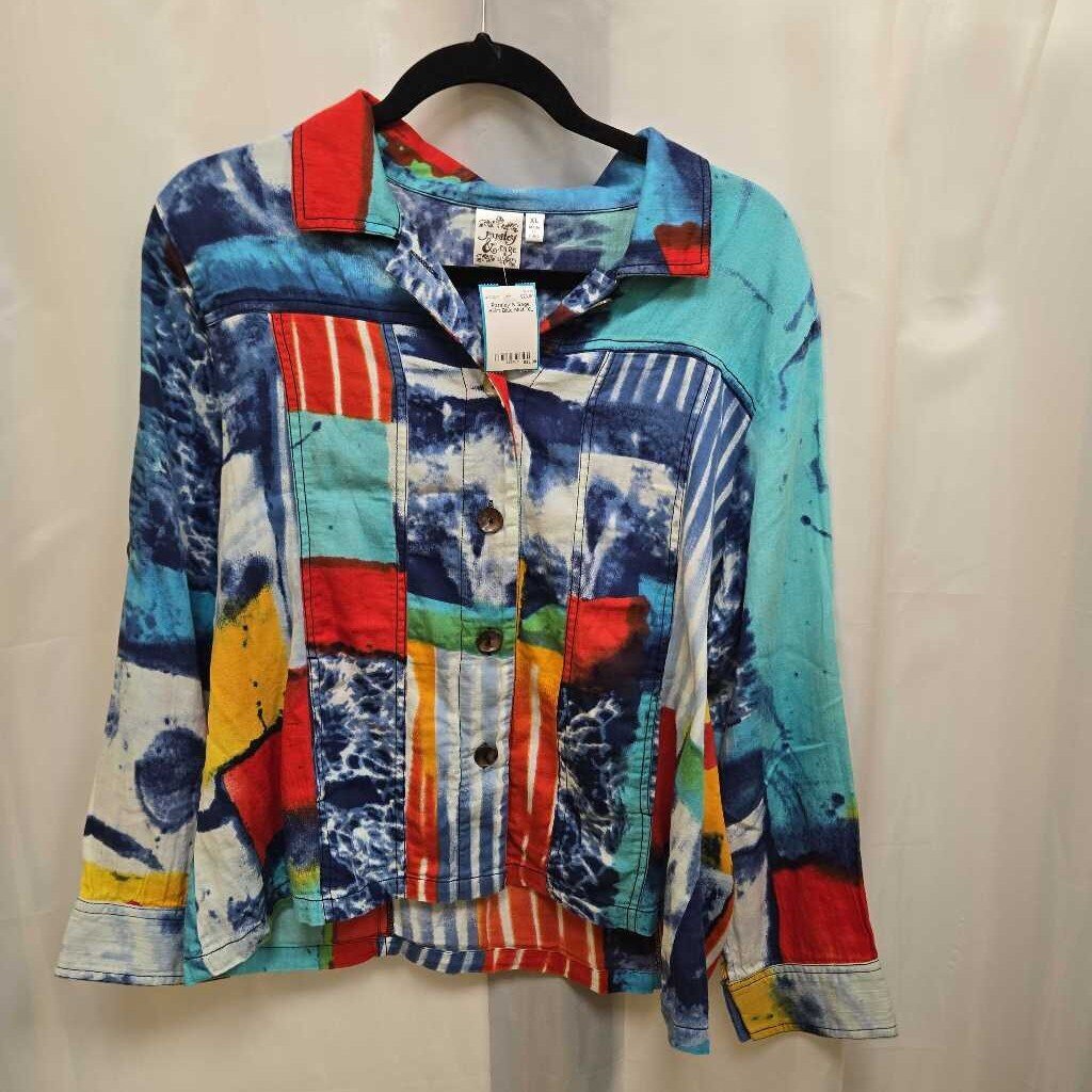 Long sleeve abstract printed button front shirt with collar and cuffs.