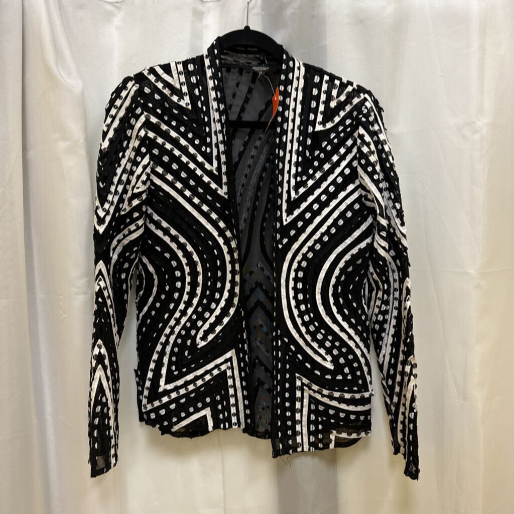 Long sleeve stretch mesh with soutache polka dot printed ribbon trim.