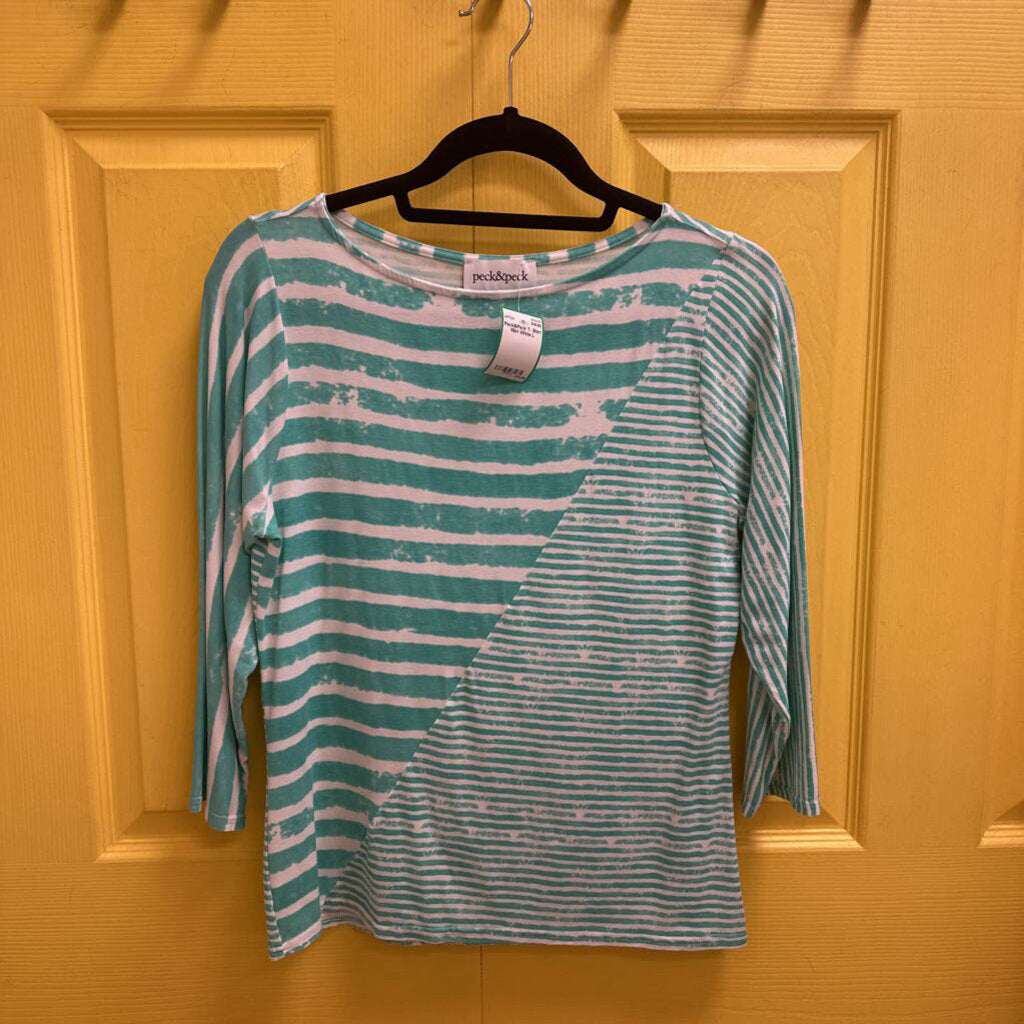 3/4 sleeve stripe block printed knit pull over t- shirt with Bateau neckline.