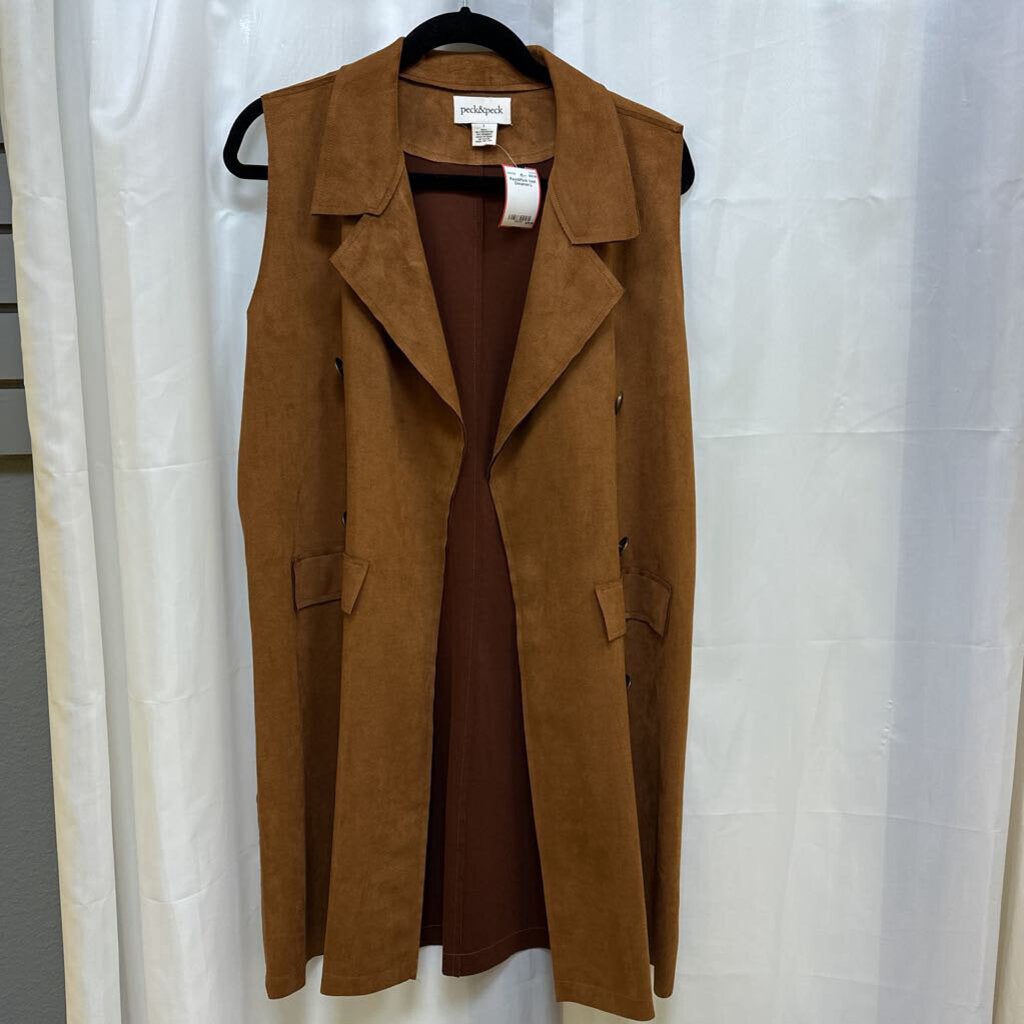 Sleeveless vegan suede open long vest with notch collar and button details.