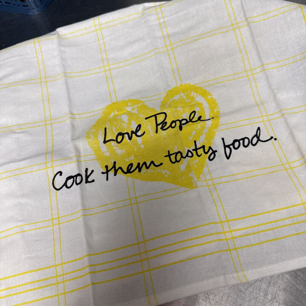 NWOT; white towel with yellow heart; printed "Love people, cook them tasty food"