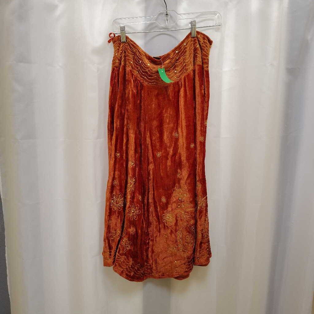 Midi length orange velvet a- line skirt with metallic gold embroidery and gold sequin accents.