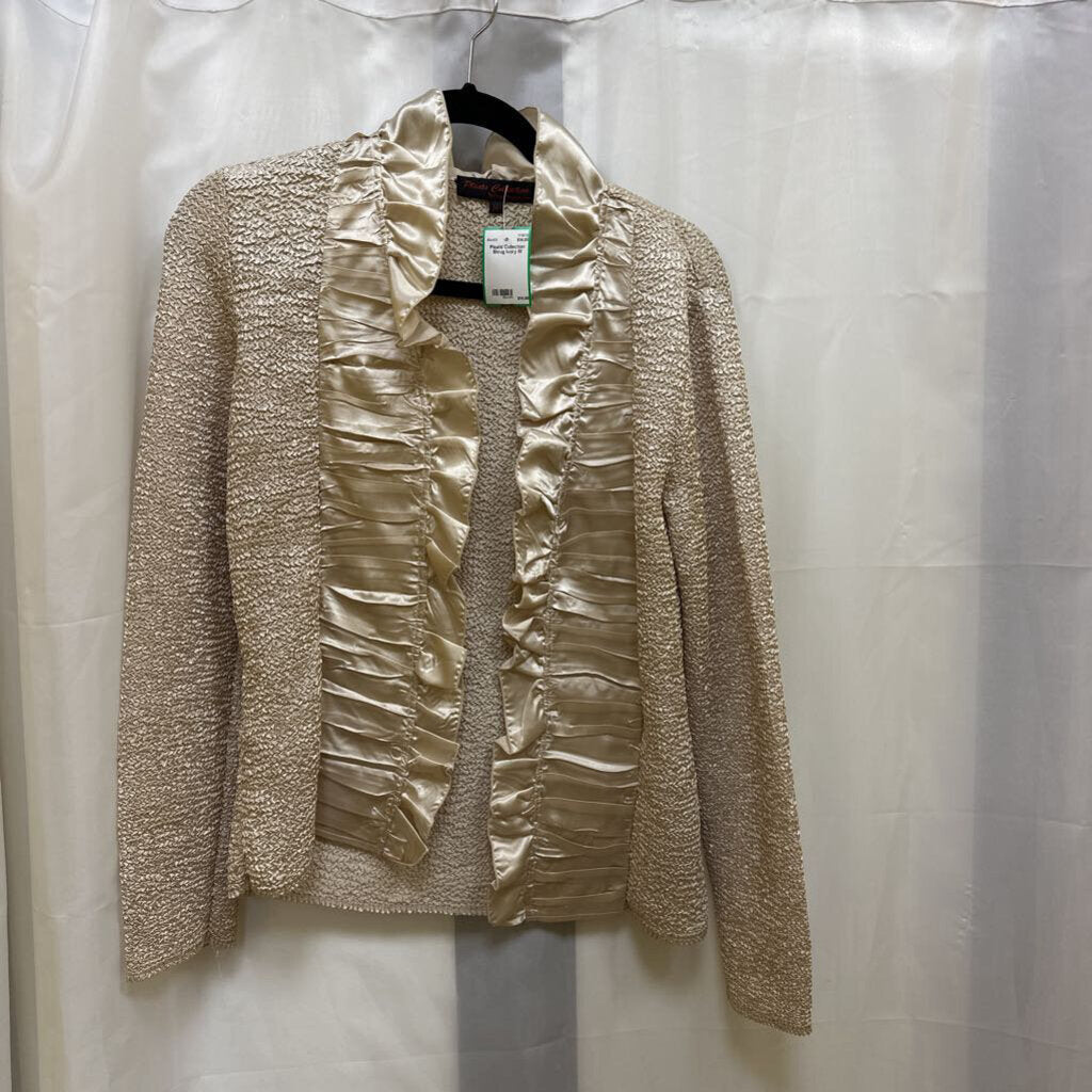Long sleeve pleated pull on woven shrug with ruffle collar and down front detail.