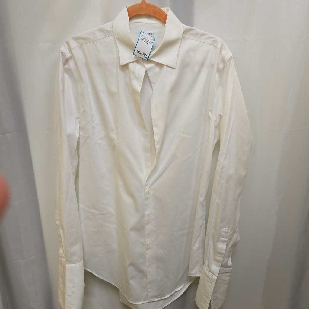 Long sleeves, button down w/collar, slim fit, non iron, 100% cotton. Falls past waist.