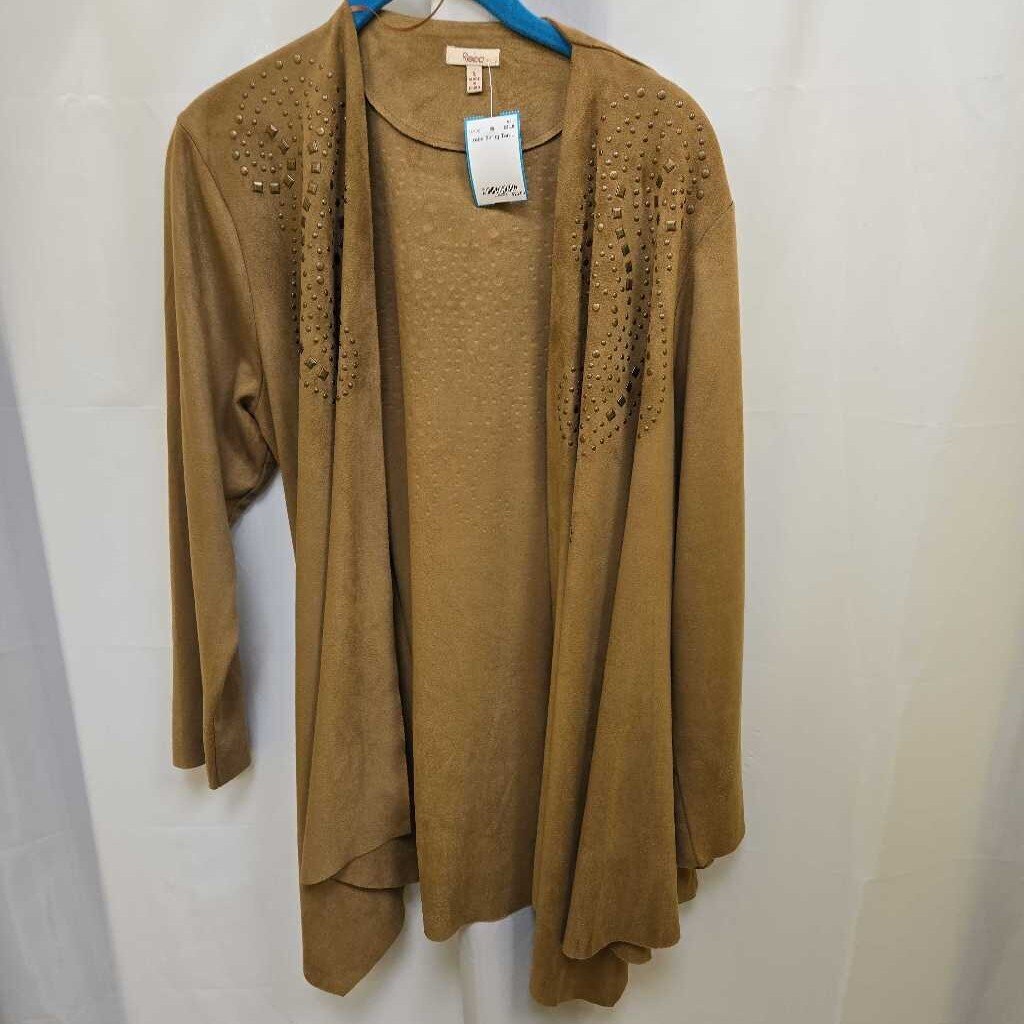 No closure, long sleeves, gold tone stud work in front and back. Falls past waist. Cute!