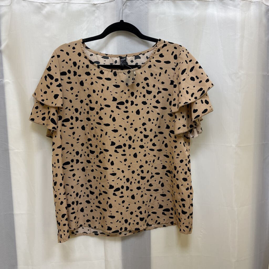 Short ruffle sleeve pull over animal printed woven blouse with scoop neckline.