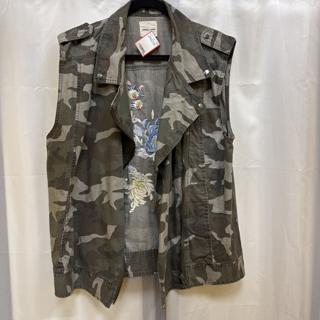 Camouflage with pockets on front, button up. Embroidery floral on back
