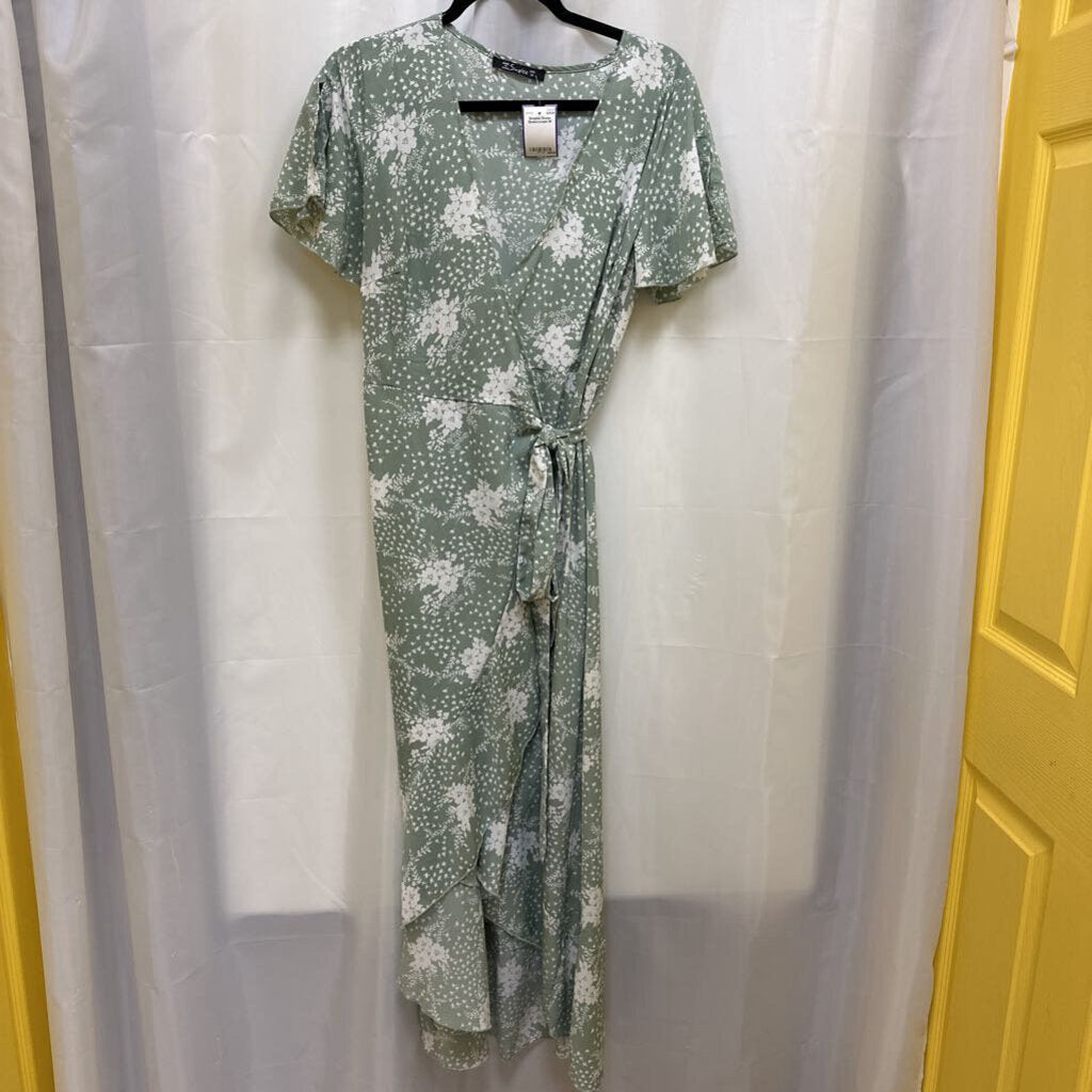 Wrap around with tie in front, vneck, shore sleeves, High/low hem line with tiered ruffle. Cream flower design, falls to ankles.