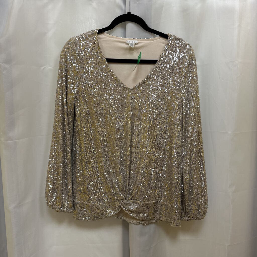 Long sleeve mini silver tone all over sequin stretch knit pull over top with knot front hem.