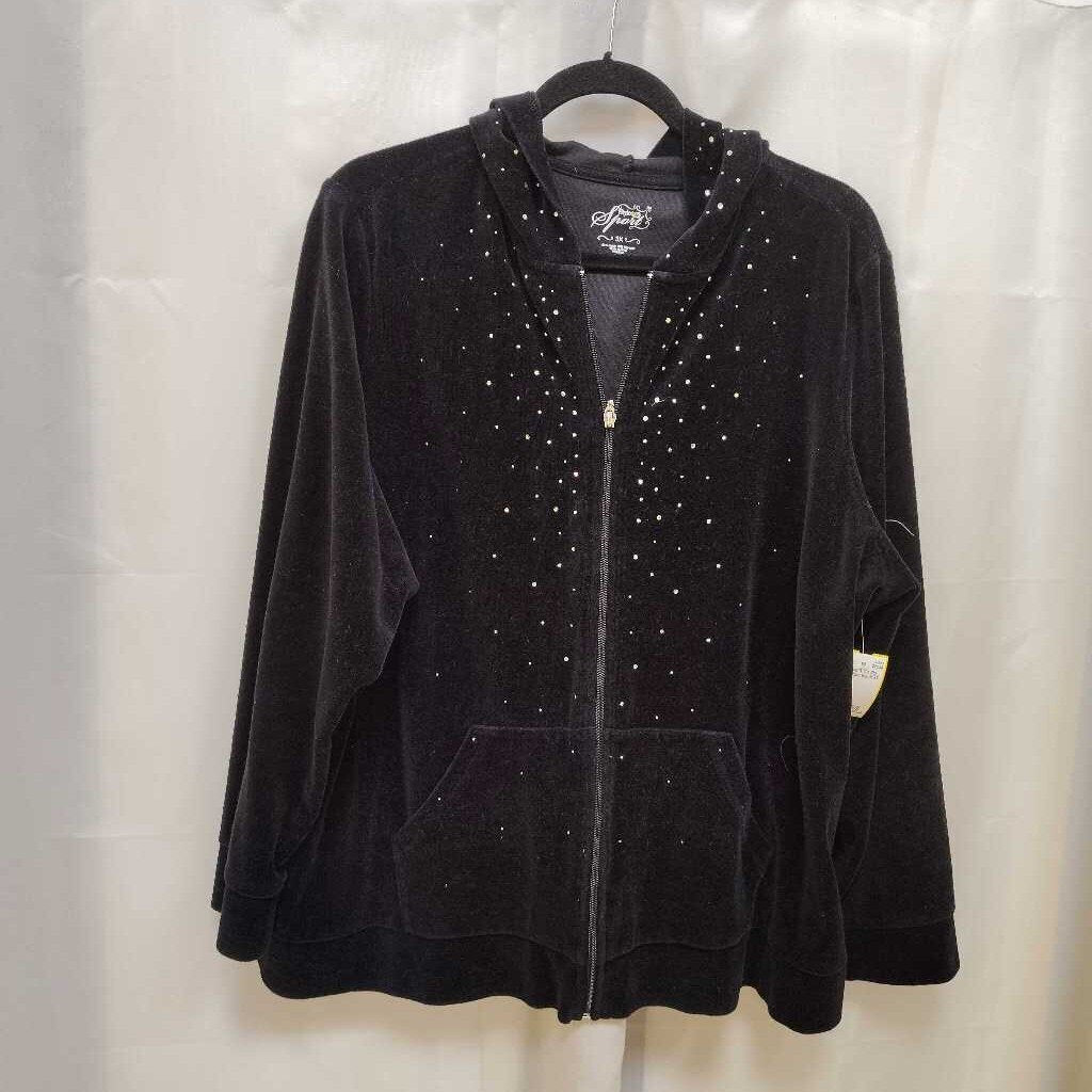 Long sleeve black zip front hoodie cardigan with kangaroo front pocket and silver stud and rhinestone fronts.