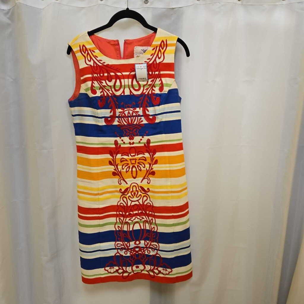 Sleeveless multi stripe shift short dress with red embroidered fronts.