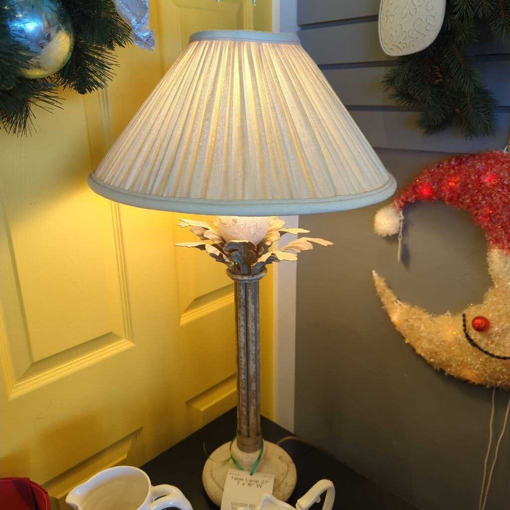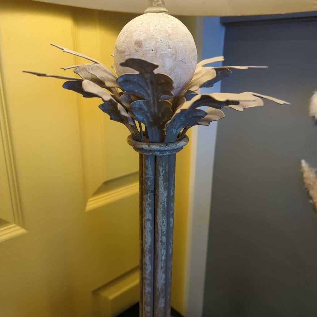 Lamp has distressed look. Has stone base and stone ball at top of base. Has metal with leaves on it. The lamp shade clips to the bulb.
