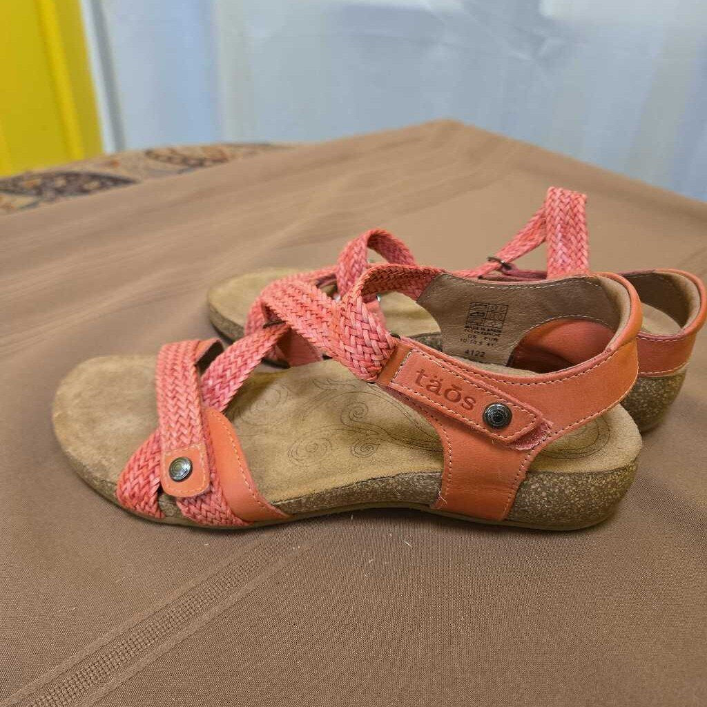 Braided leather crisscross slight wedge sandal with Velcro closure and rubber soles.