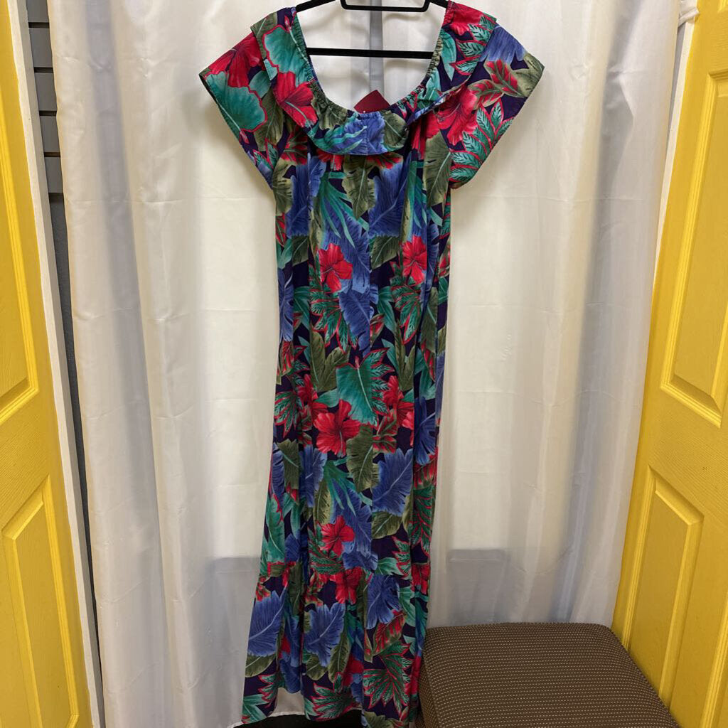 Full length , cap sleeve , ruffle neckline , large blue palm leaves , green palm leaves , large red tropical flowers