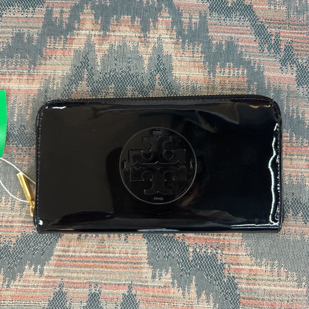 Tory Burch black patent leather zip around continental wallet.