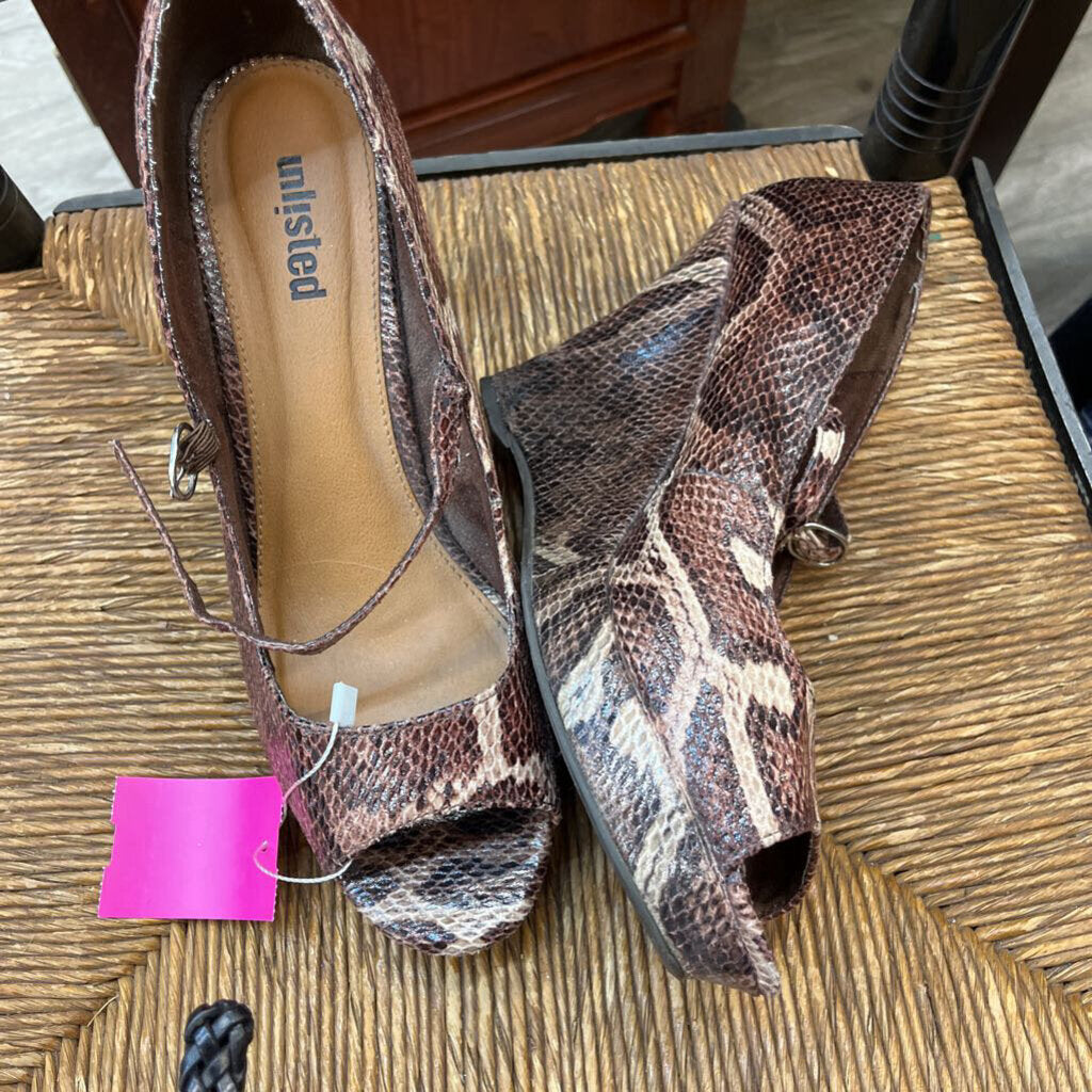 Brown snake skin wedge heeled peep toe Mary Jane shoes.