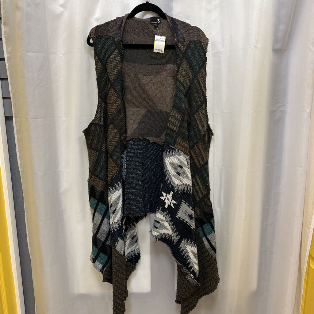 Sleeveless large fuzzy knitted and patchwork pull on shrug.