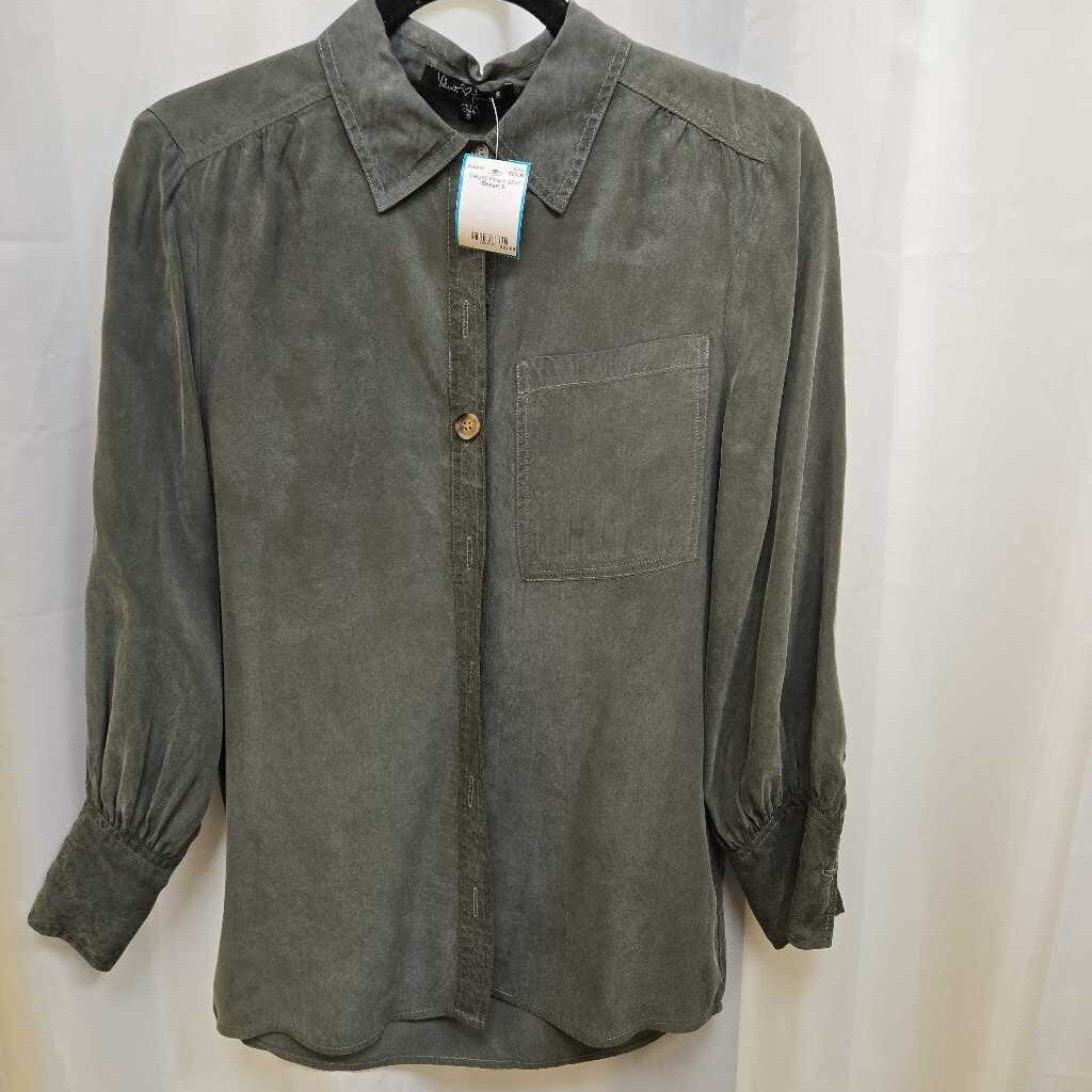 Long sleeve button front one pocket silk shirt with collar and cuffs.
