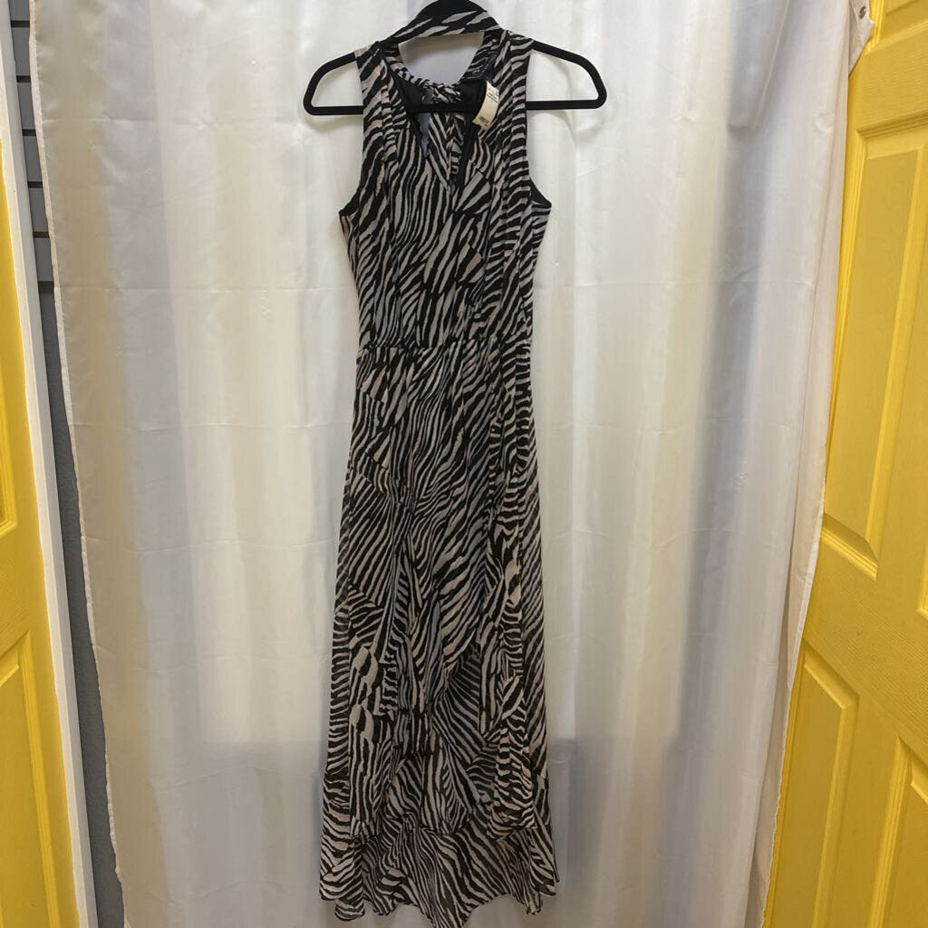 Sleeveless full length flowy ; zebra stripes with tie in back