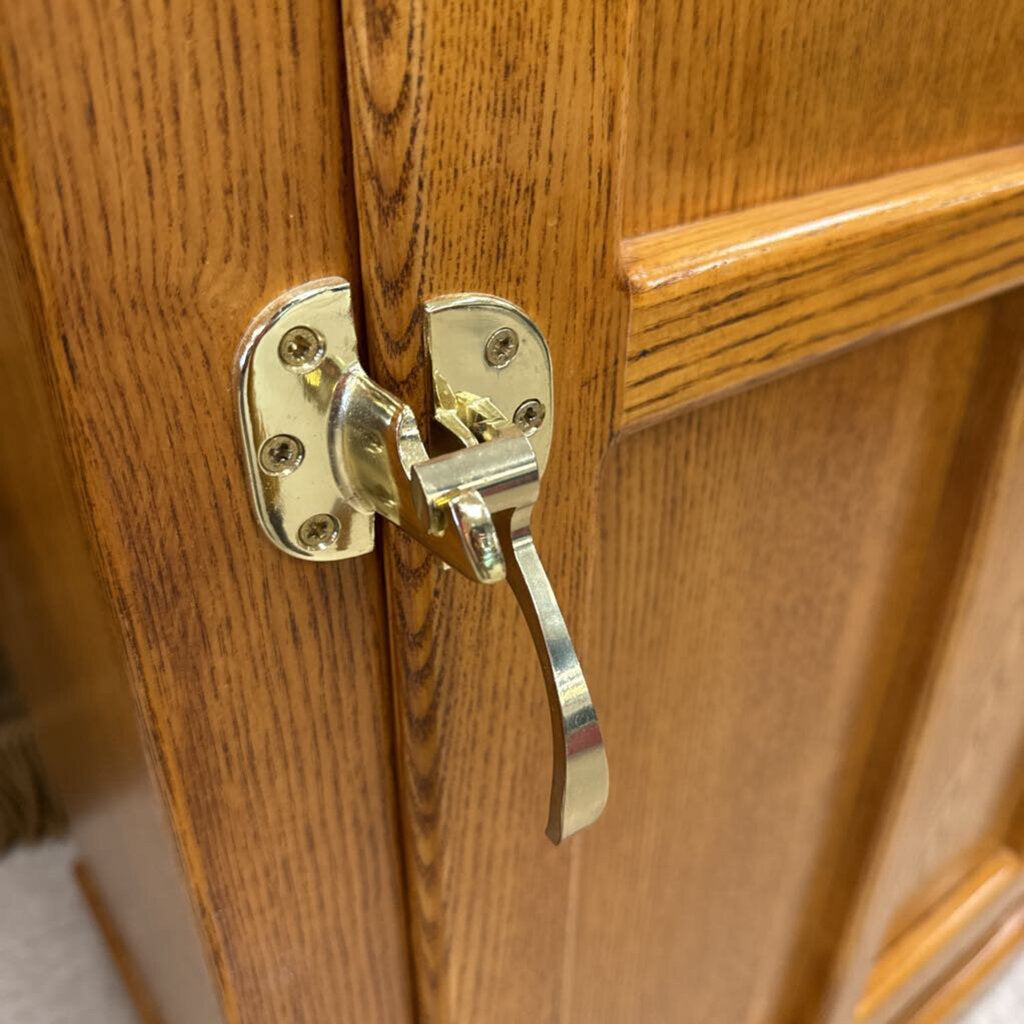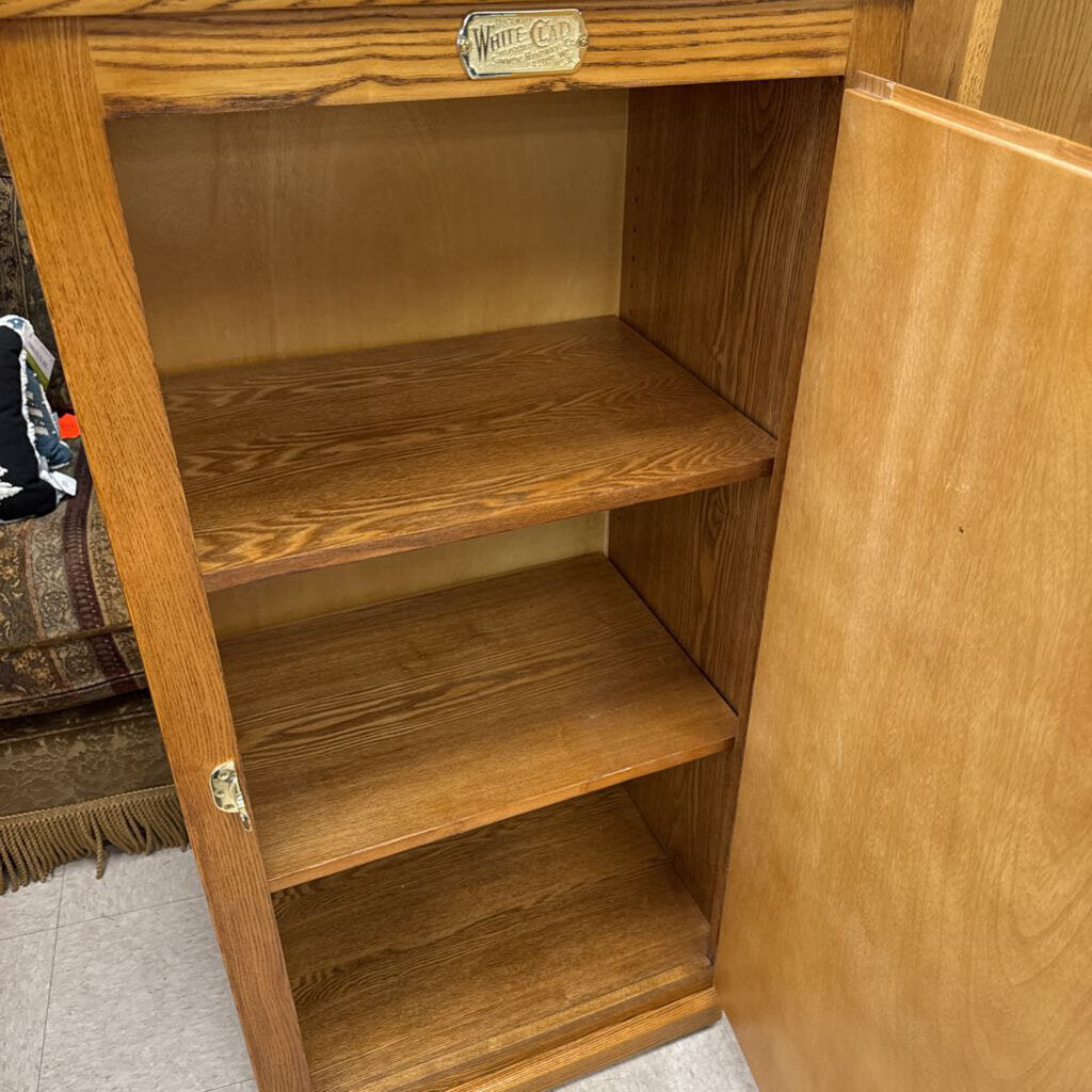 oak cabinet designed like Antique Ice Box; brass tone hinges and handles; 2 adjustable shelves