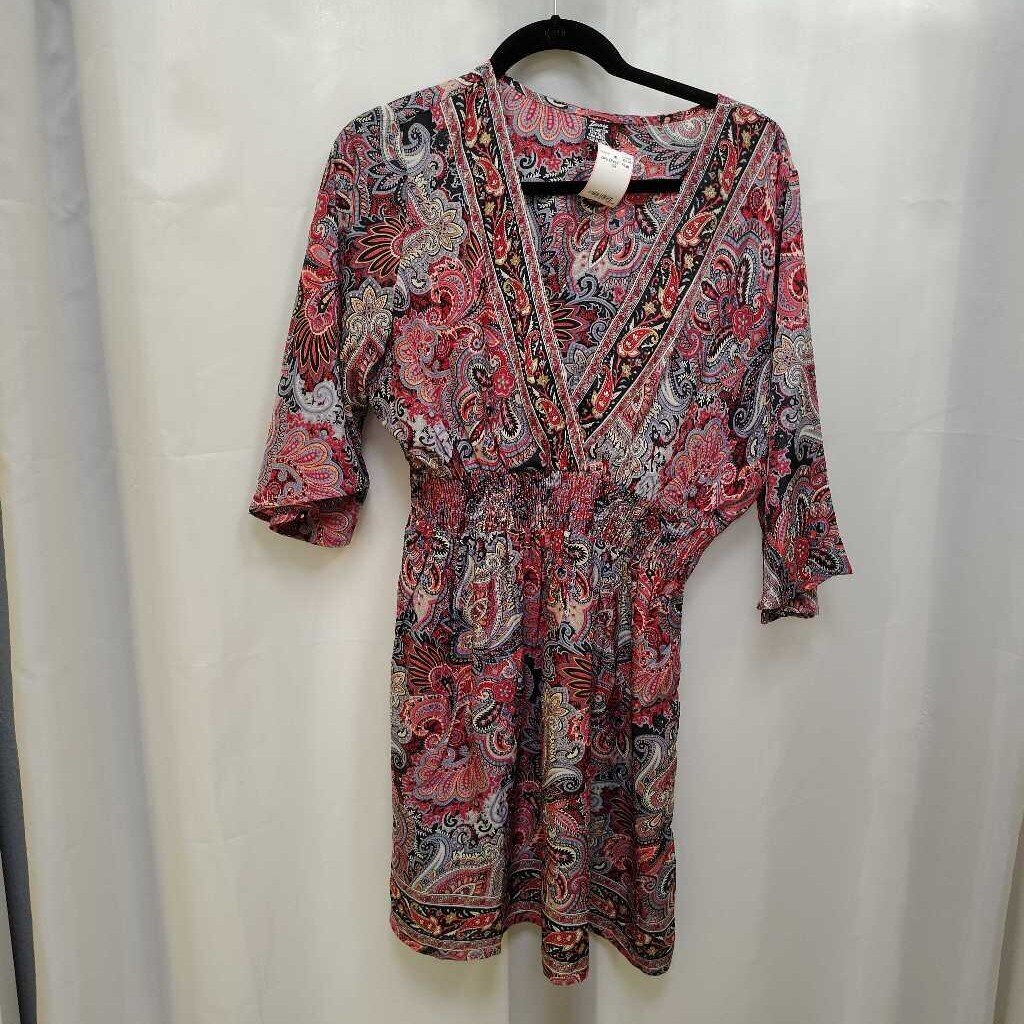 Silk , Kneeish length . smocked waist , red paisley , light blue and orange print