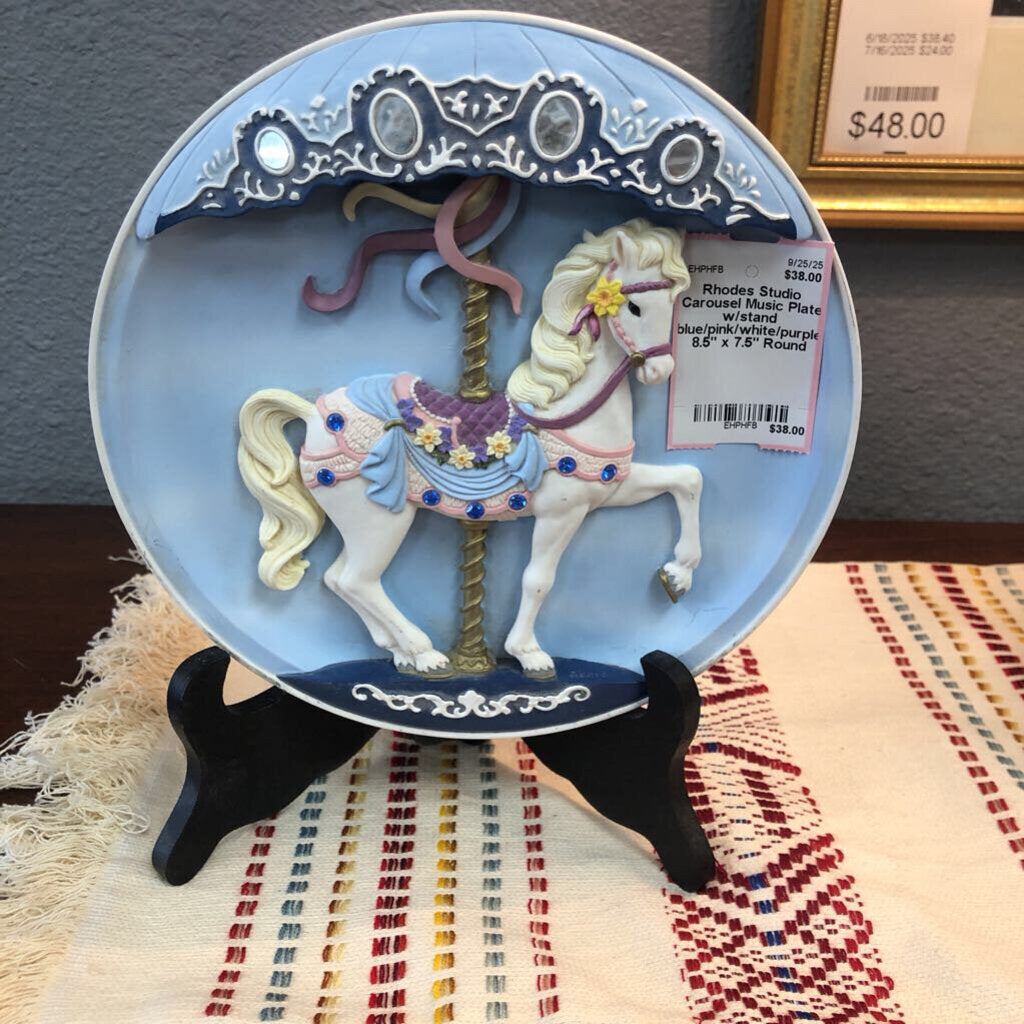 Rhodes Studio Carousel Music Plate w/stand 8.5" x 7.5" Round blue/pink/white/purple