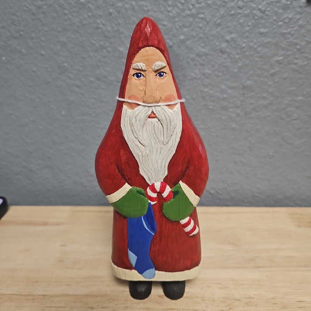 Artisan Signed Wooden Santa 9"Tx 3"W red, white, green and blue.