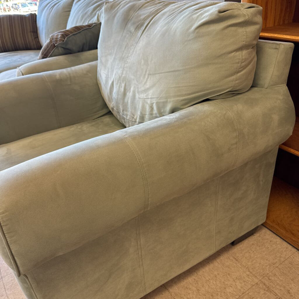18" at seat cushion; faux suede upholstery; rounded arms; attached seat back; moveable seat cushion; excellent condition