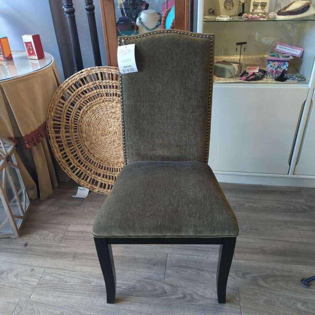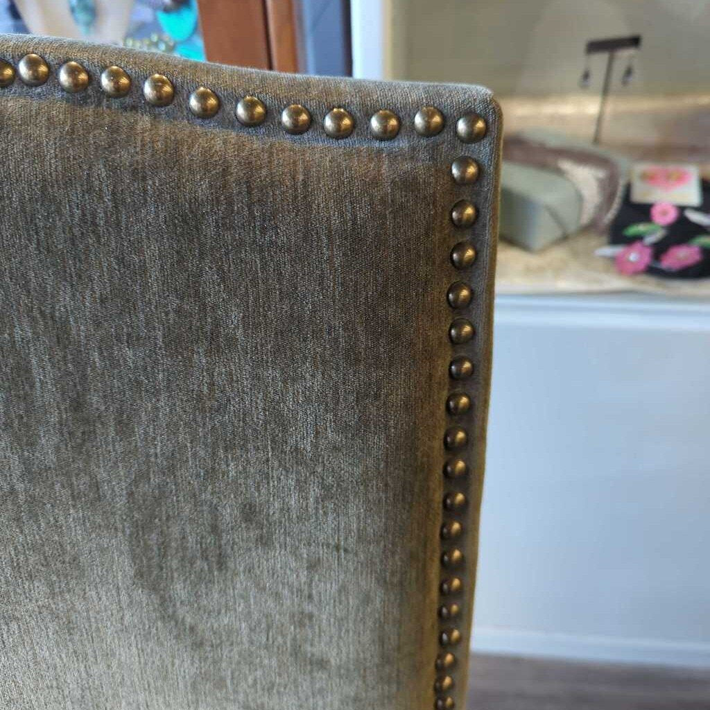Green upholstry with black wooden legs, has nailhead trim around edge of seat back.
