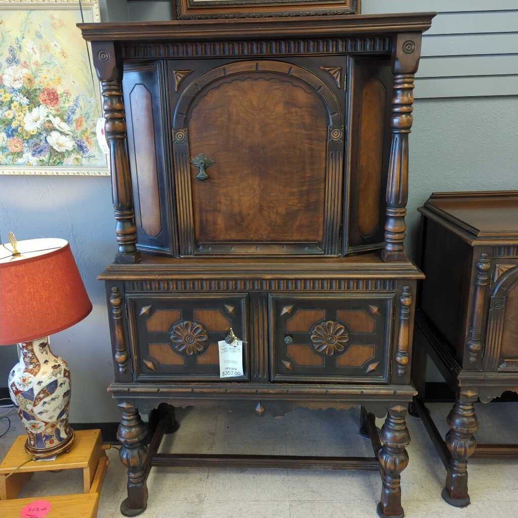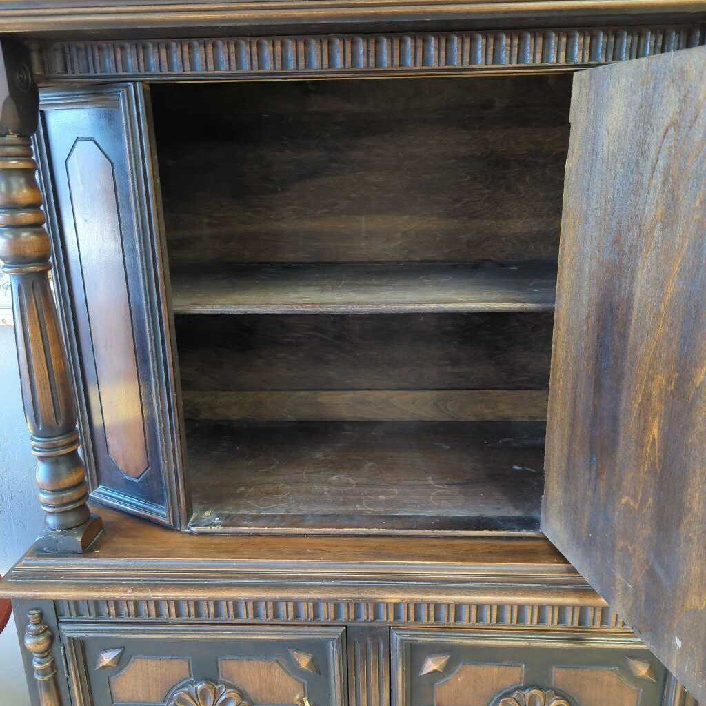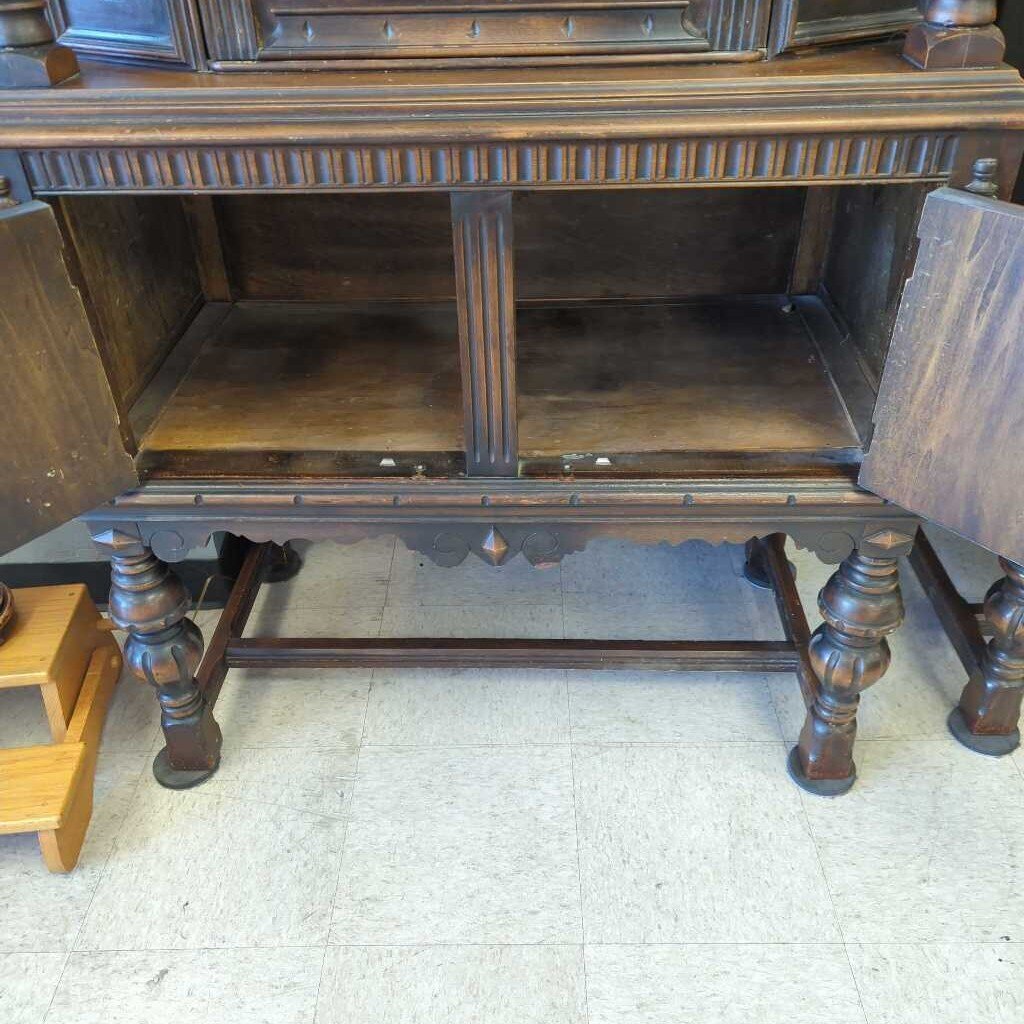 Jacobean style hutch with one cabinet on the top with one shelf inside. The bottom has two cabinet doors all with metal pulls.