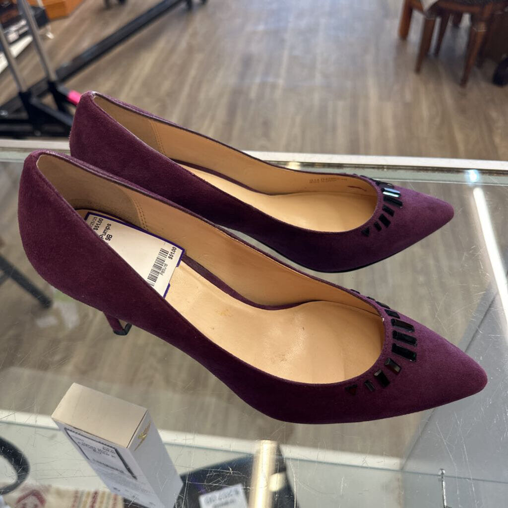 Purple suede leather slip on pumps with pointy toes and 3" heels.
