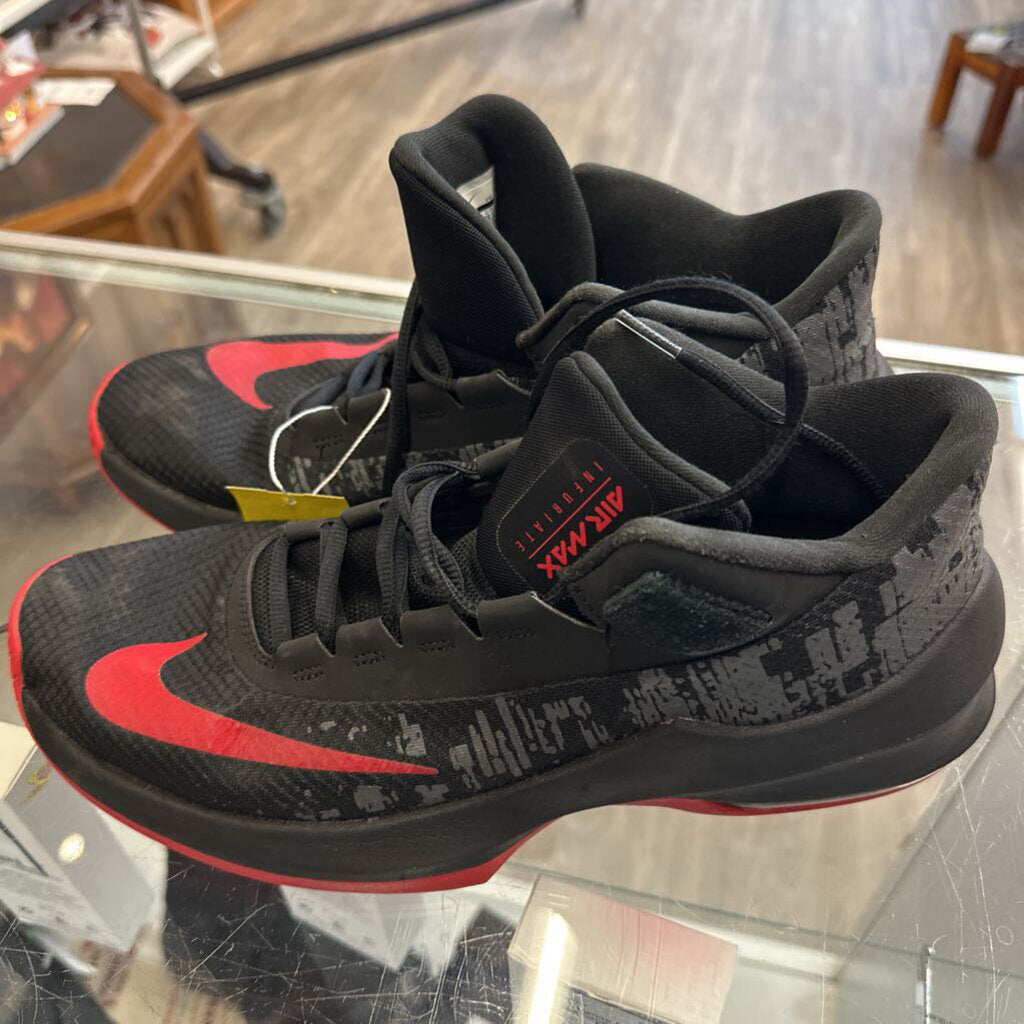 Nike Air Max Men's Infuriate 2 mid basketball shoes in black and university red colorway.