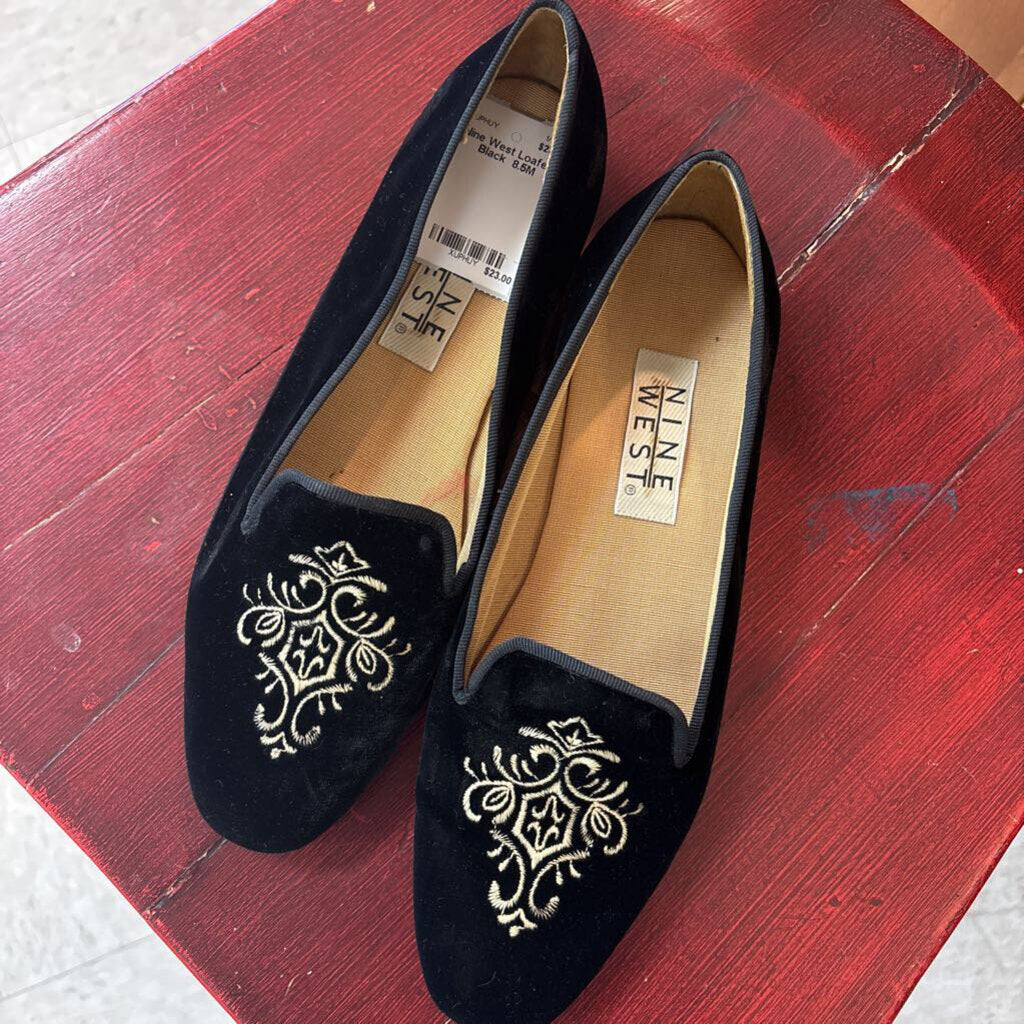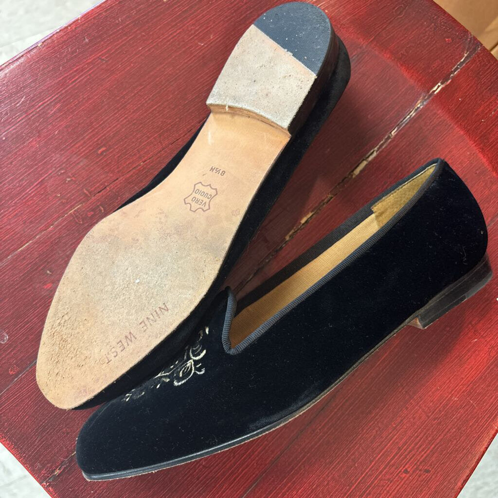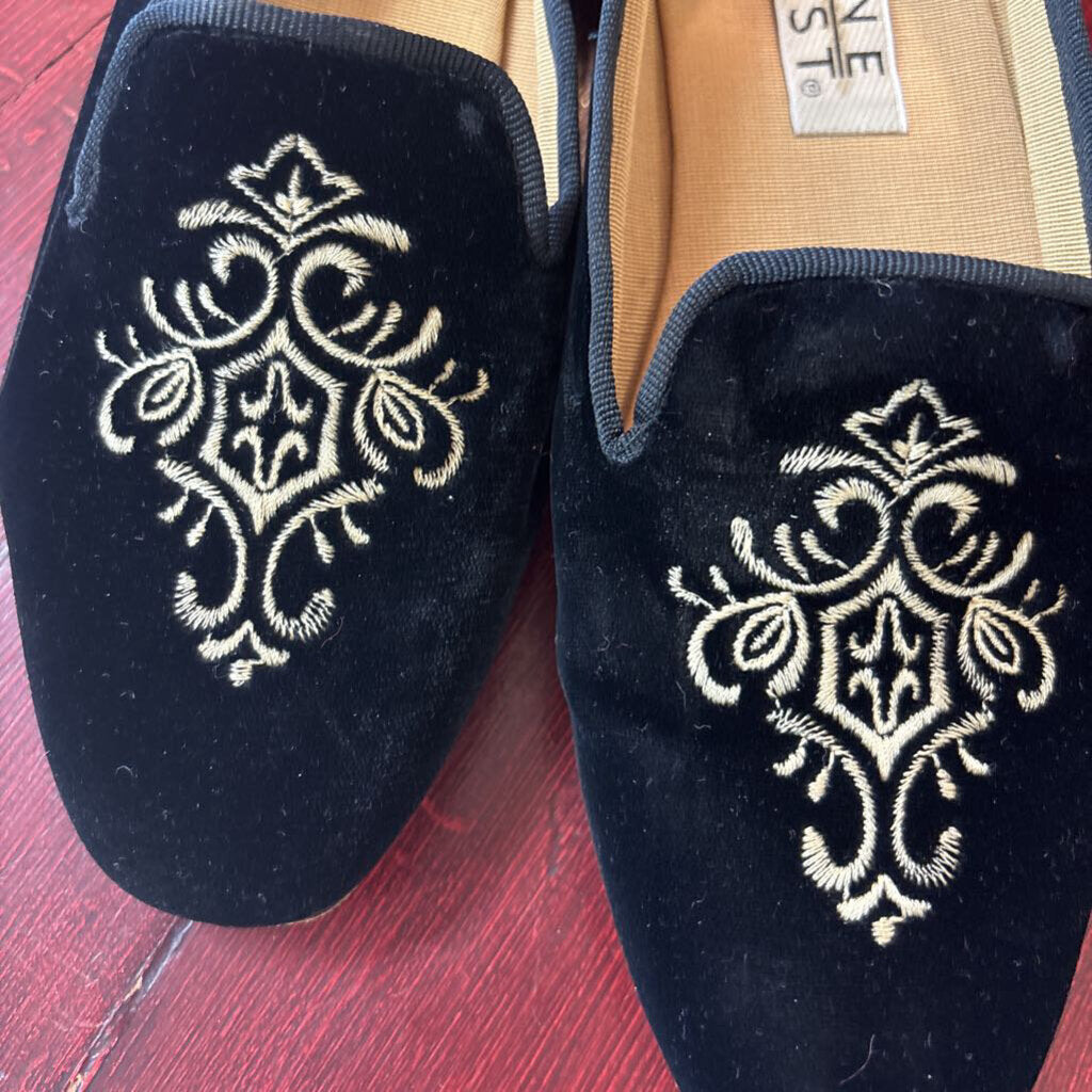 Black velvet slip on loafers with embroidered toes and leather soles.