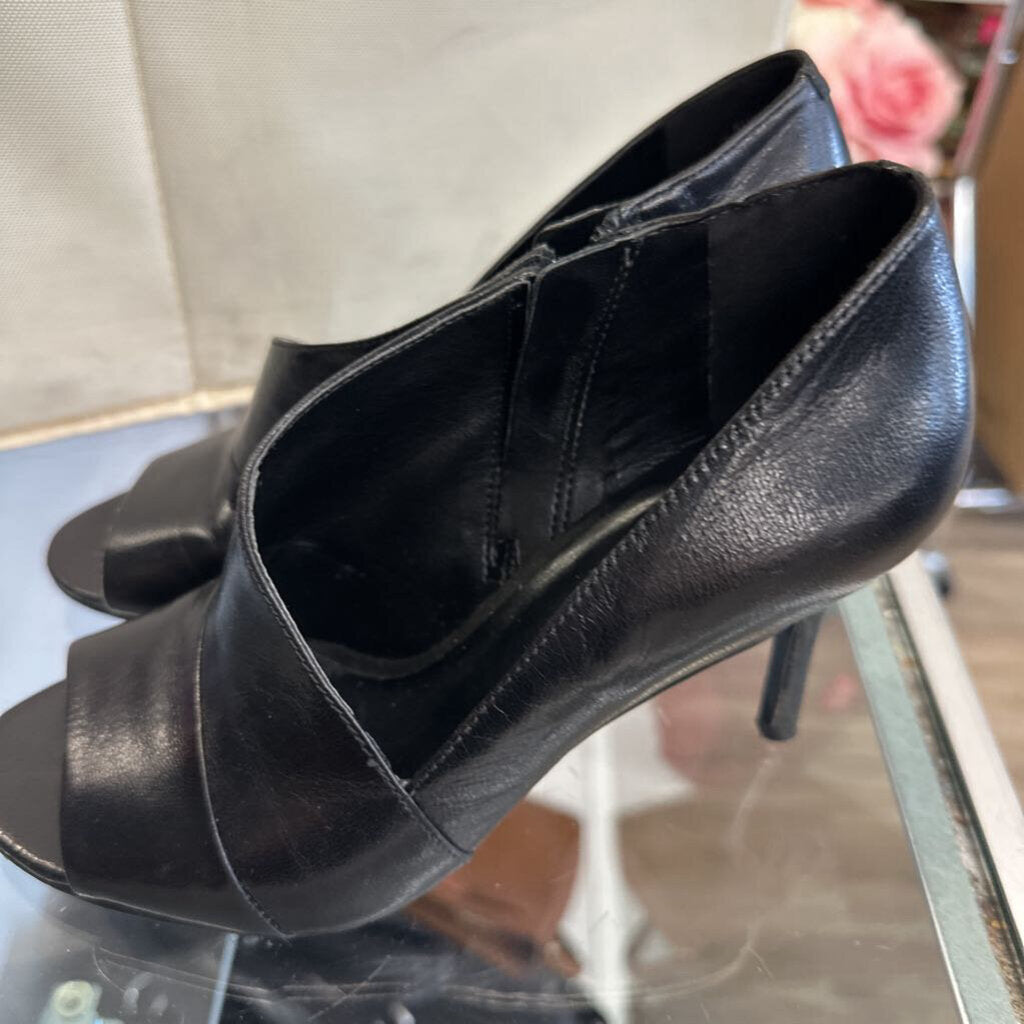 Black leather peep toe heel booties with side zippers and 3" heels.