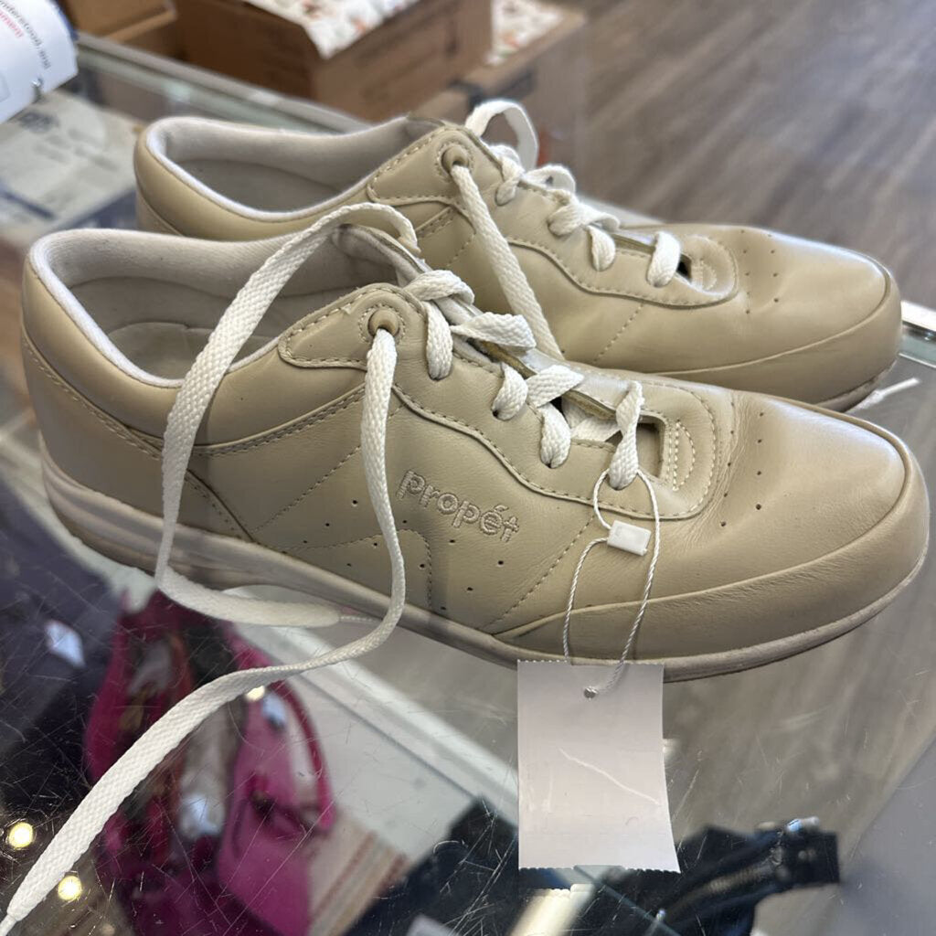 Beige leather Propet washable Walker sneaker walking shoes.