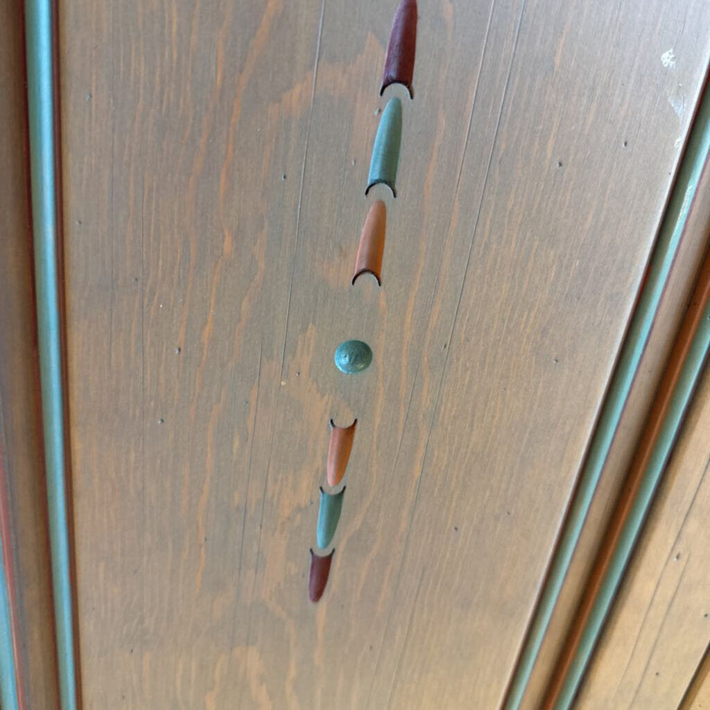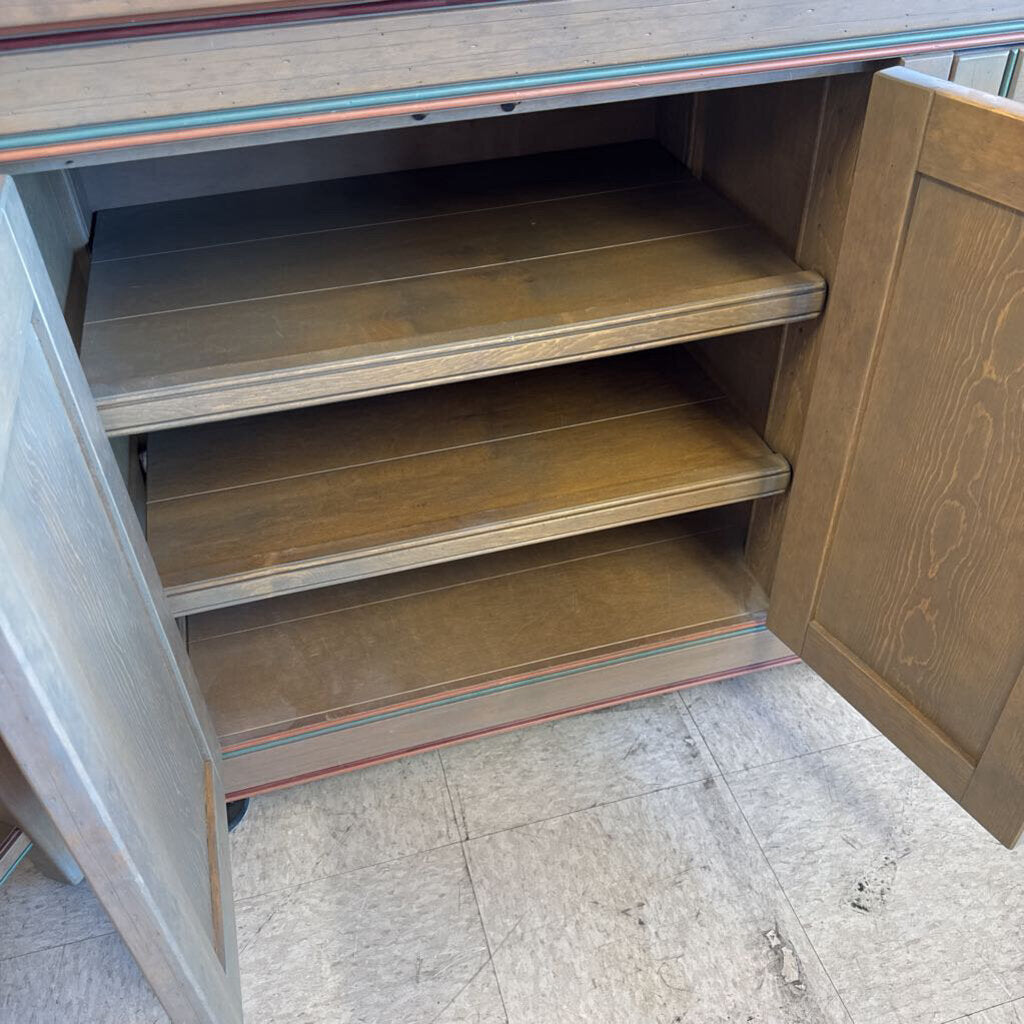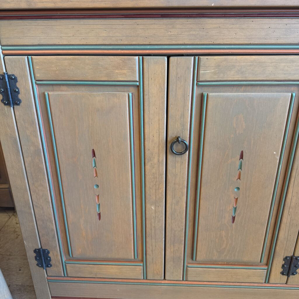 3 double door storage areas with adjustable shelving; metal round pulls; painted and carved accents