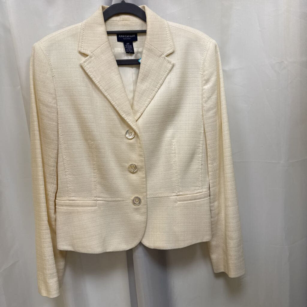 Long sleeve solid ivory fitted button front blazer with front welt pockets and notch collar. It comes with a matching skirt sold separately.