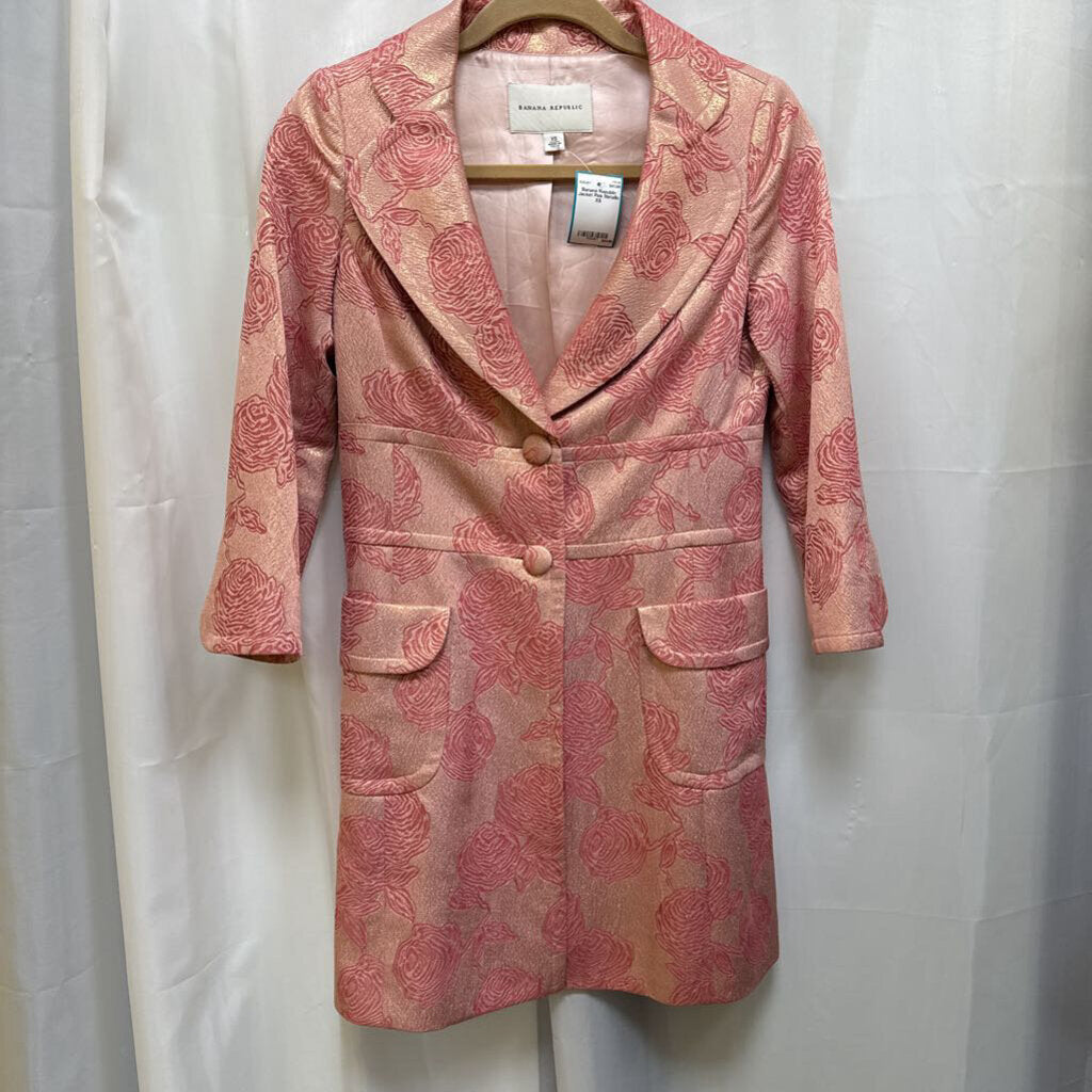 3/4 sleeve rose metallic brocade jacket with rounded notch collar, front patch pockets, and fully lined.