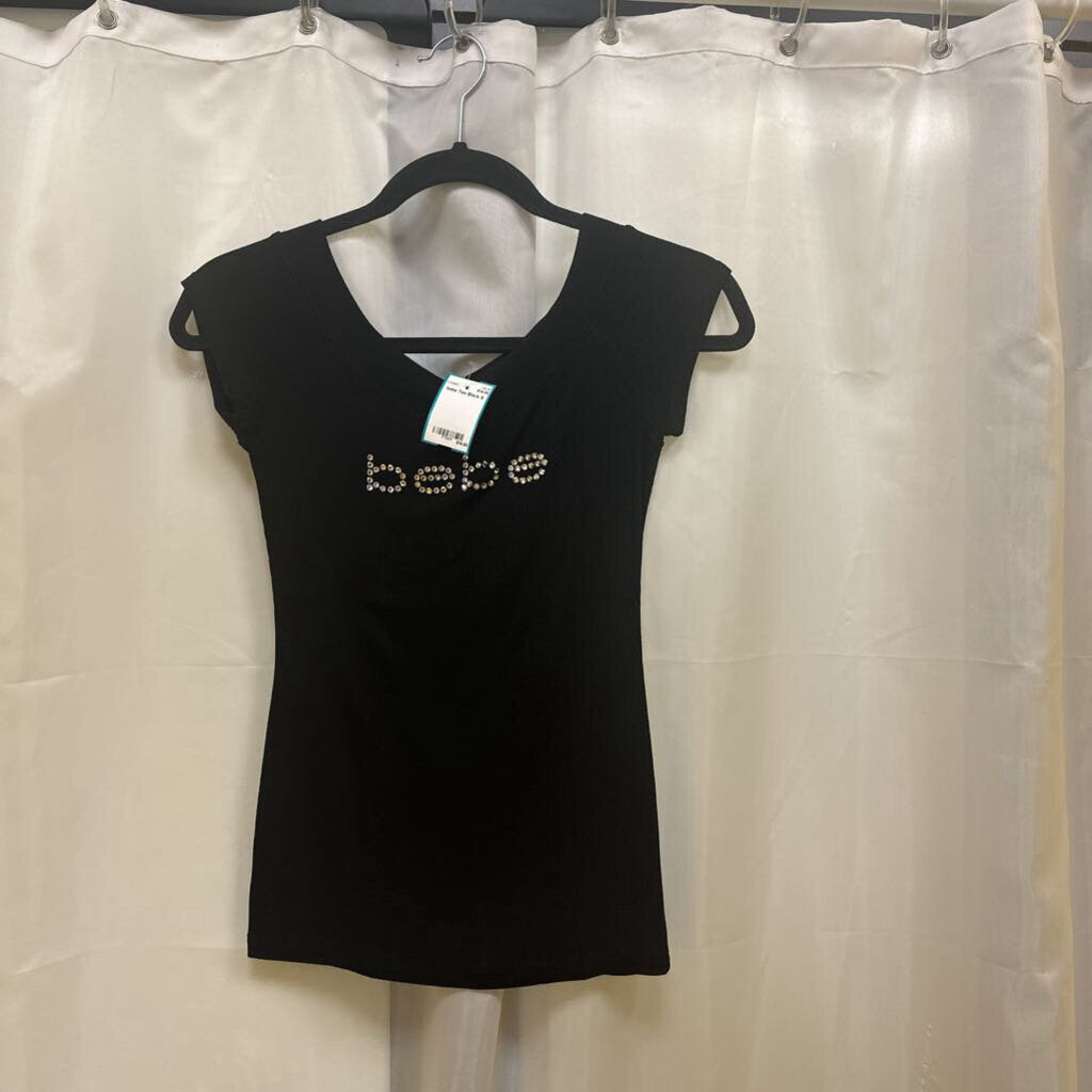 Cap raglan sleeve rib knit pull over tee with low V- necklines and rhinestone logo front accent.